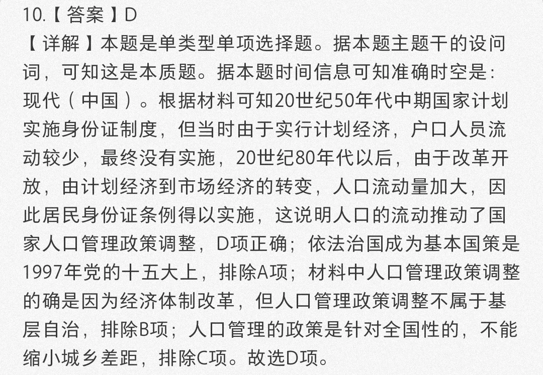 【详解】本题是单类型单项选择题。据本题主题干的设问词,可知这是本质题。据本题时间信息可知准确时空是:现代(中国)。根据材料可知20世纪50年代中期国家计划实施身份证制度,但当时由于实行计划经济,户口人员流动较少,最终没有实施,20世纪80年代以后,由于改革开放,由计划经济到市场经济的转变,人口流动量加大,因此居民身份证条例得以实施,这说明人口的流动推动了国家人口管理政策调整,D项正确;依法治国成为基本国策是1997年党的十五大上,排除A项;材料中人口管理政策调整的确是因为经济体制改革,但人口管理政策调整不属于基层自治,排除B项;人口管理的政策是针对全国性的,不能缩小城乡差距,排除C项。故选D项。