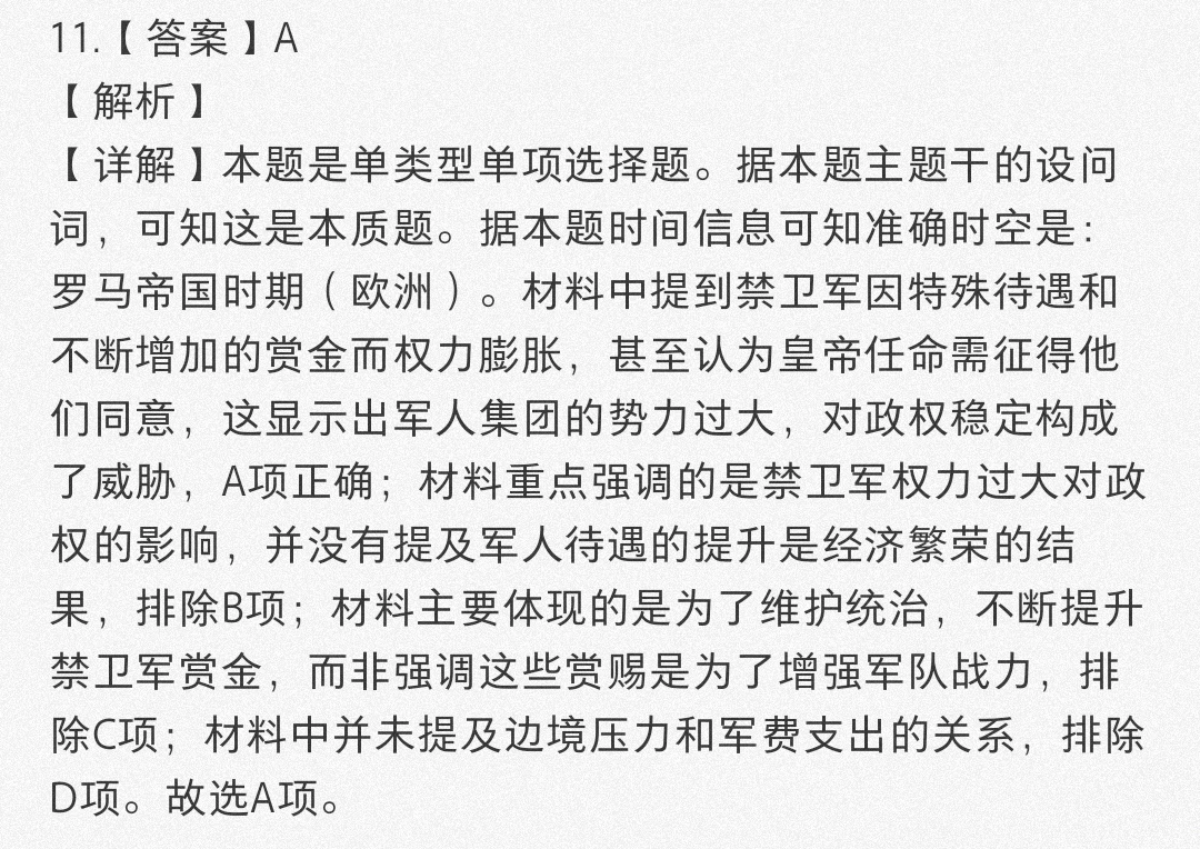【详解】本题是单类型单项选择题。据本题主题干的设问词,可知这是本质题。据本题时间信息可知准确时空是:罗马帝国时期(欧洲)。材料中提到禁卫军因特殊待遇和不断增加的赏金而权力膨胀,甚至认为皇帝任命需征得他们同意,这显示出军人集团的势力过大,对政权稳定构成了威胁,A项正确;材料重点强调的是禁卫军权力过大对政权的影响,并没有提及军人待遇的提升是经济繁荣的结果,排除B项;材料主要体现的是为了维护统治,不断提升禁卫军赏金,而非强调这些赏赐是为了增强军队战力,排除C项;材料中并未提及边境压力和军费支出的关系,排除D项。故选A项。