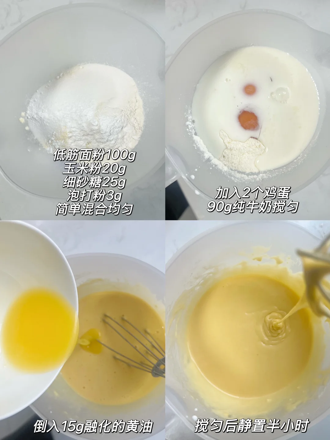 ✅面糊配方(大概能做5个) 低筋面粉100g、玉米粉20g、细砂糖25g、鸡蛋2个、牛奶90g、泡打粉3g、融化黄油15g(或者玉米油15g) —— 加了玉米粉的外壳颜色更好看,如果没有的话就用替换成低筋面粉 做的时候模具正反面提前预热一会 全程小火!小火!小火! 做完一个可以等模具稍微冷却一会再做下一个,不然后面目模具温度太高很容易糊 我用的自己做的豆沙馅,成品馅料也ok,爱吃什么加什么