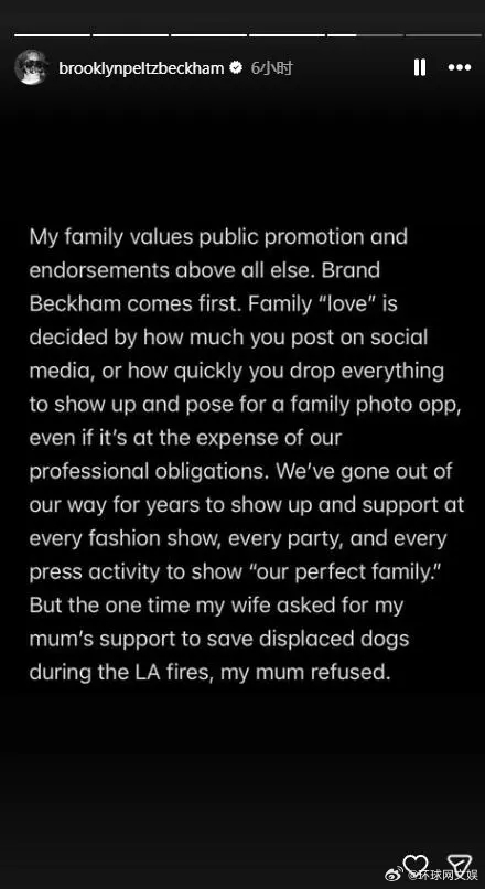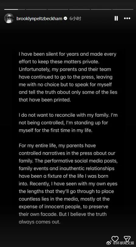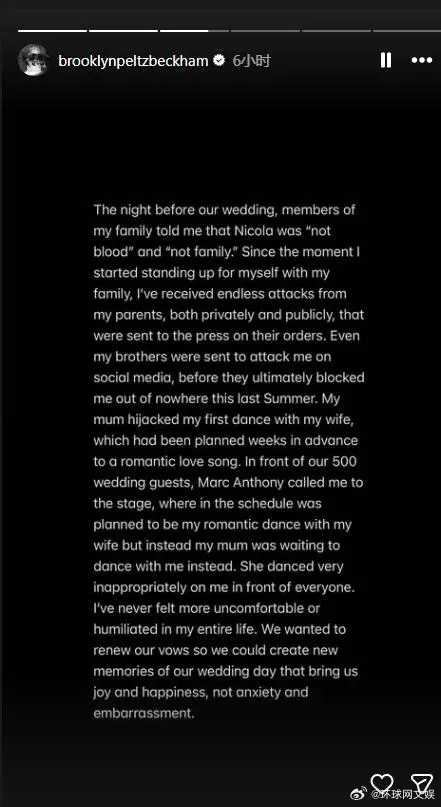 【#贝克汉姆长子称父母的爱取决于社媒发文数据# 】在贝克汉姆一家“取关”的罗生门闹得沸沸扬扬之际,贝克汉姆(David Beckham)的大儿子布鲁克林(Brooklyn Peltz Beckham)在当地时间19日发文控诉亲爸亲妈。#贝克汉姆遭大儿子控诉# 布鲁克林称“不想与我的家人和解”。“家庭的‘爱’取决于你在社交媒体的发文数量,或者你是否能迅速放下手头的一切事务,赶过来拍摄全家福照片,哪怕这样做会损害我们的工作。”布鲁克林控诉,“多年来,我们一直竭尽全力出席每一场时装秀、每一场派对以及每一次媒体活动,以展示‘我们完美的家庭’。但有一次,我妻子请求我母亲在洛杉矶火灾期间支持救助流浪动物,而我母亲却拒绝了。”他还着重强调了父母在自己与妮可拉的婚礼前以及婚礼上的行为。据布鲁克林描述,在结婚前,他的父母就一直不遗余力地破坏他和妮可拉的关系。甚至在婚礼前,“我妈妈在最后一刻取消了为妮可拉制作婚纱礼服的计划,尽管她非常期待自己设计的婚纱,这让她(妮可拉)不得不紧急寻找新的礼服。”他还称在婚礼前夜,家人告诉他妮可拉“不是血亲”,也“不是家人”。而且,在他开始为自己抗争之后,就遭到了父母无休止的攻击,他的兄弟们也在社交媒体上攻击他,甚至屏蔽了他。第一支舞是他和妻子提前数周精心安排的一首浪漫情歌。然而到了现场,在500名宾客面前,在计划跳第一支舞的场地上等着他的却是亲妈。这还不够,据称维多利亚当时在所有人面前非常不恰当地贴着儿子跳舞。“我这辈子从未感到如此尴尬和羞辱。”布鲁克林说。#贝克汉姆长子称婚礼是最屈辱的时刻#