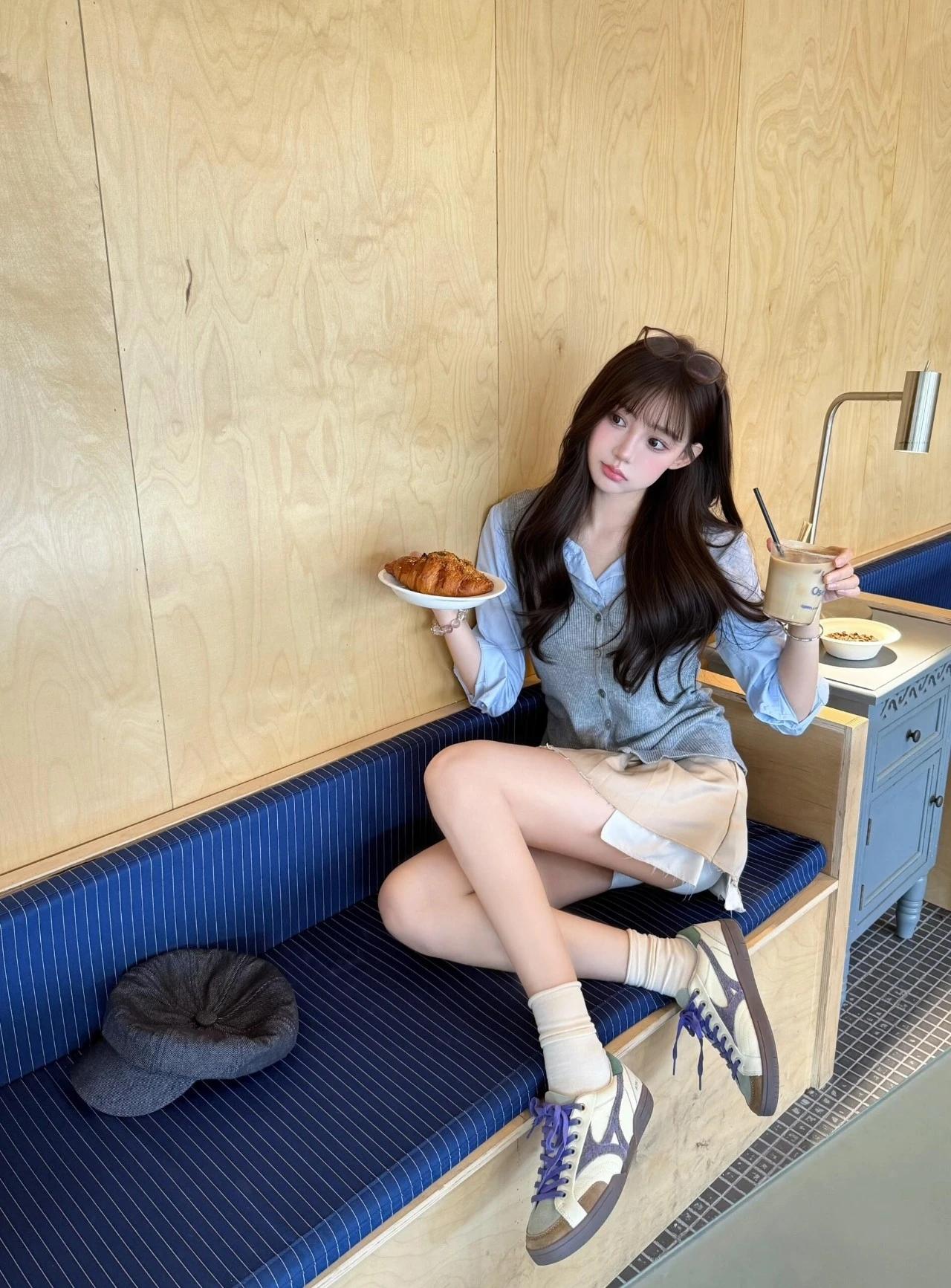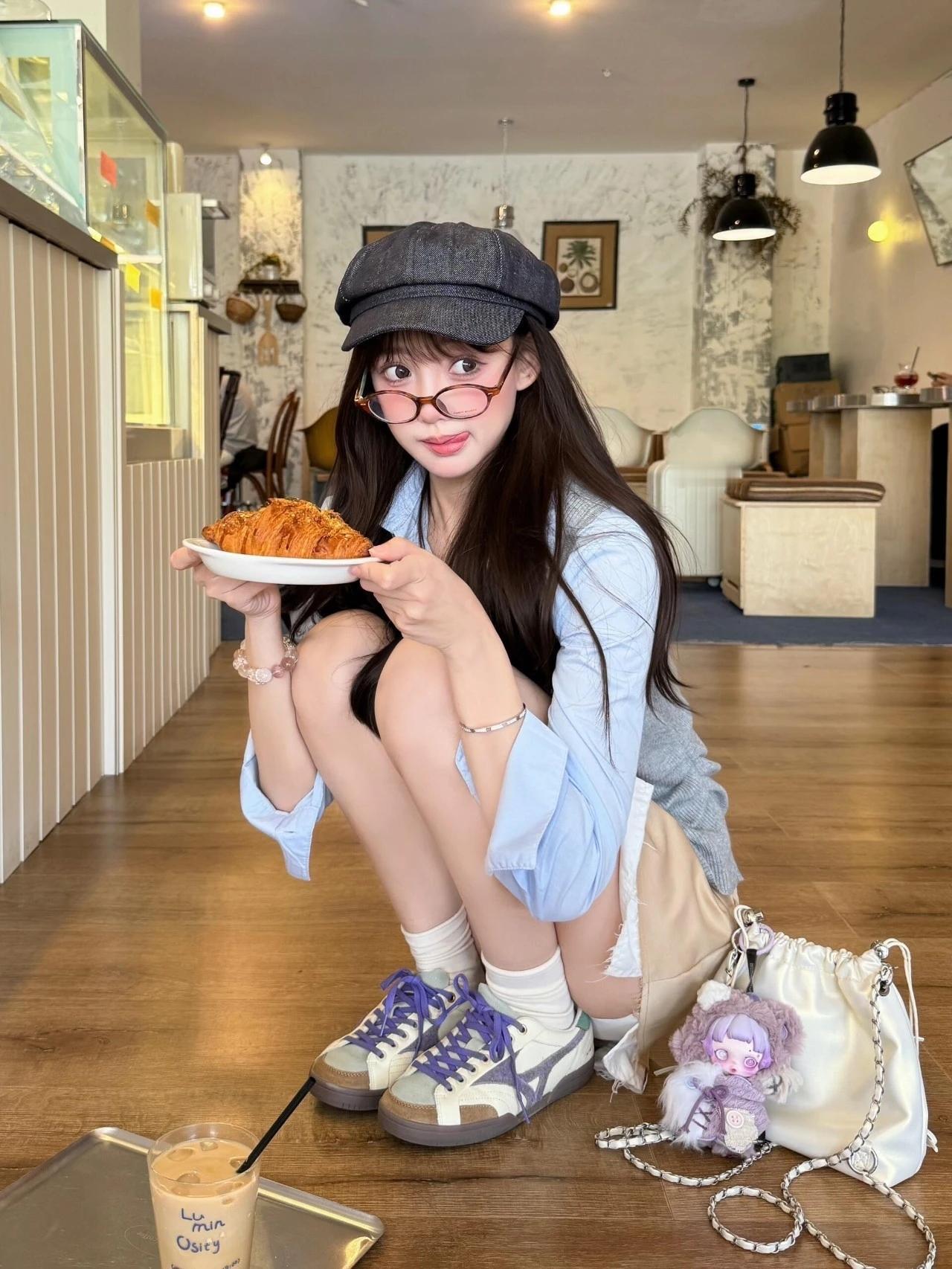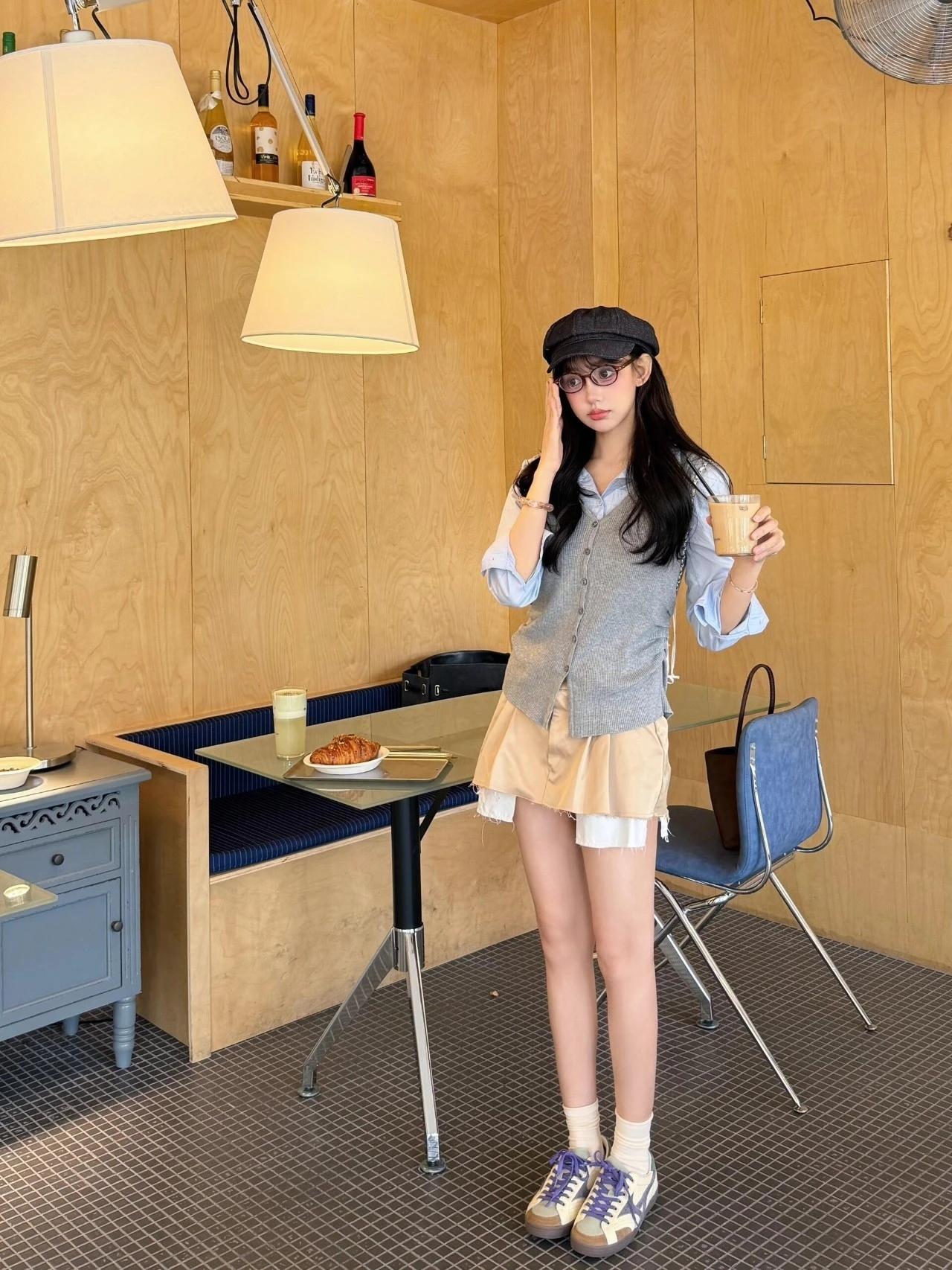 浅灰色针织马甲叠穿清爽衬衫,贝雷帽一戴,慵懒松弛感直接拉满。