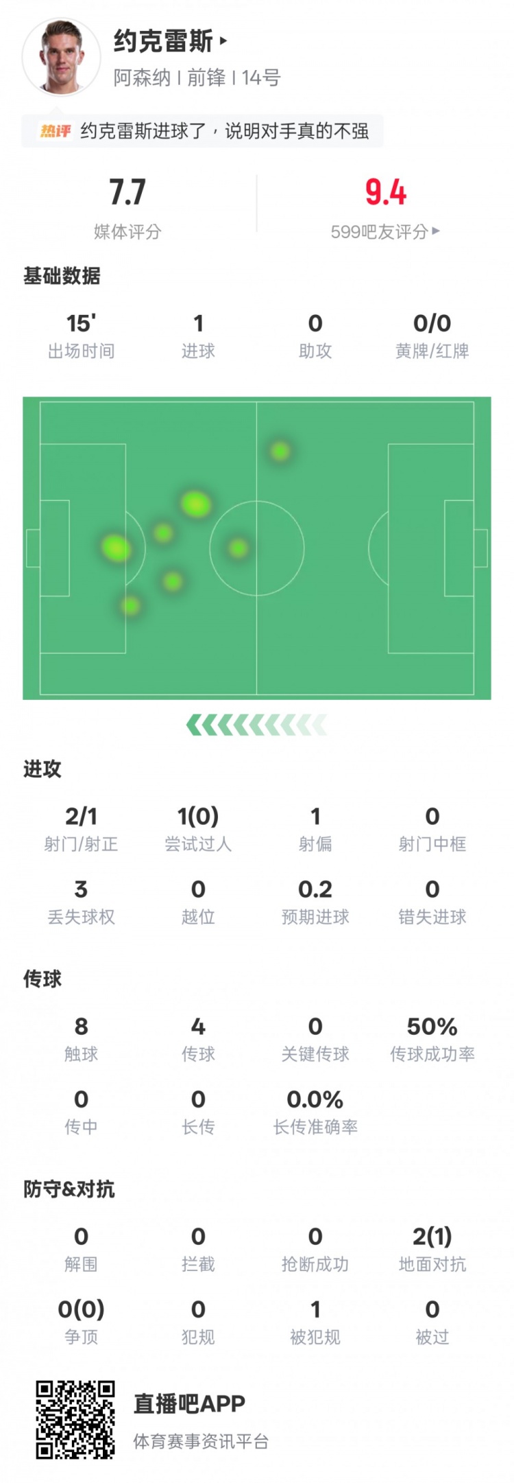 约克雷斯本场数据:替补出战15分钟,2射门1射正1进球,评分7.7