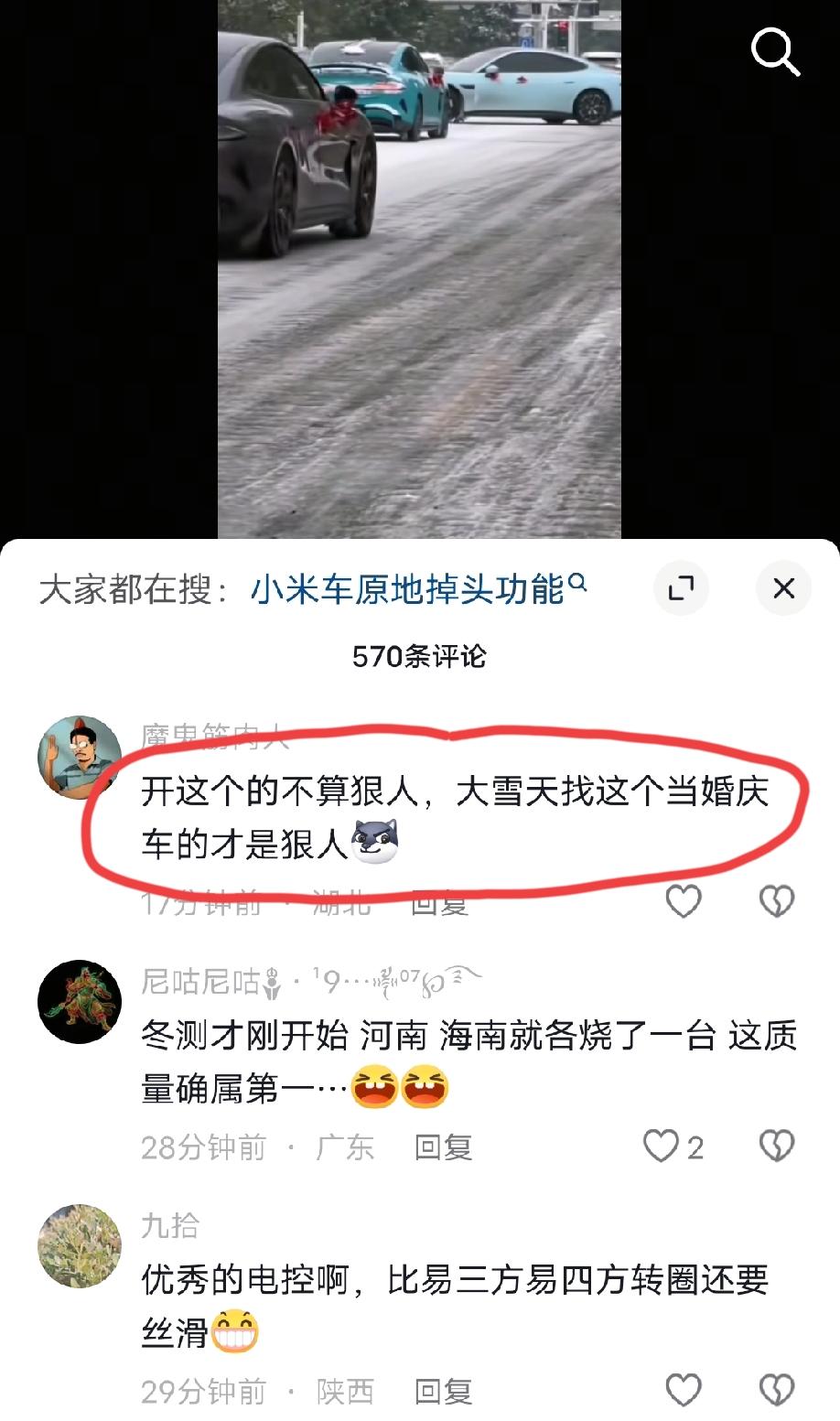 网友吐槽:开这个的还不算狠人,大雪天找这个当婚庆车的才是狠人。 确实是这样,大马力又是后驱,像这种下雪天,能踹踹微微走在路上已经非常不错了,还去跑婚车,咱也不知道这新人和汽车租赁公司老板到底是怎么想的。就像这个视频里面一样,动不动打滑甩尾,还有可能趴窝,哪里还能准时准点接到新人,这不是耽误事吗? 这几天全国各地都在下雪,开车上路真的要特别小心,有些车还是尽量不要上路!!!
