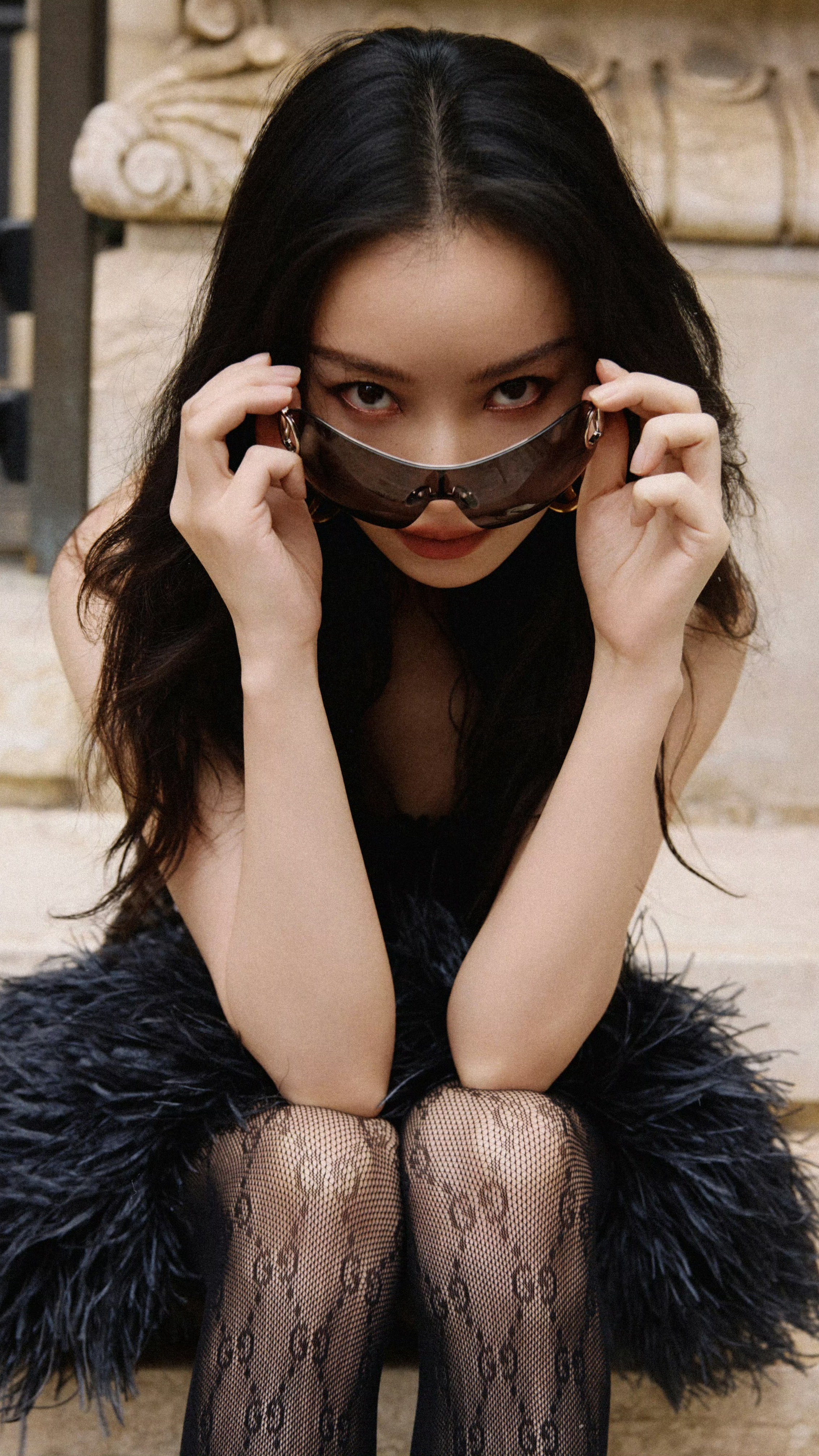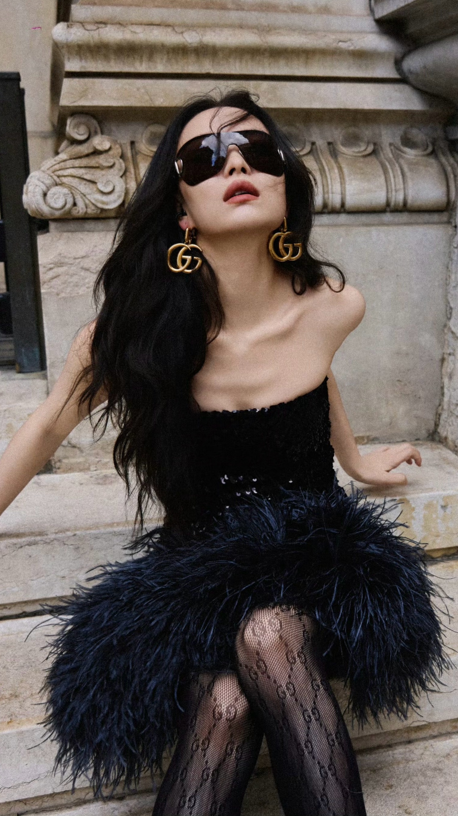 倪妮米兰时装周,抹胸黑裙,丝袜妆造大长腿全身照。倪妮
