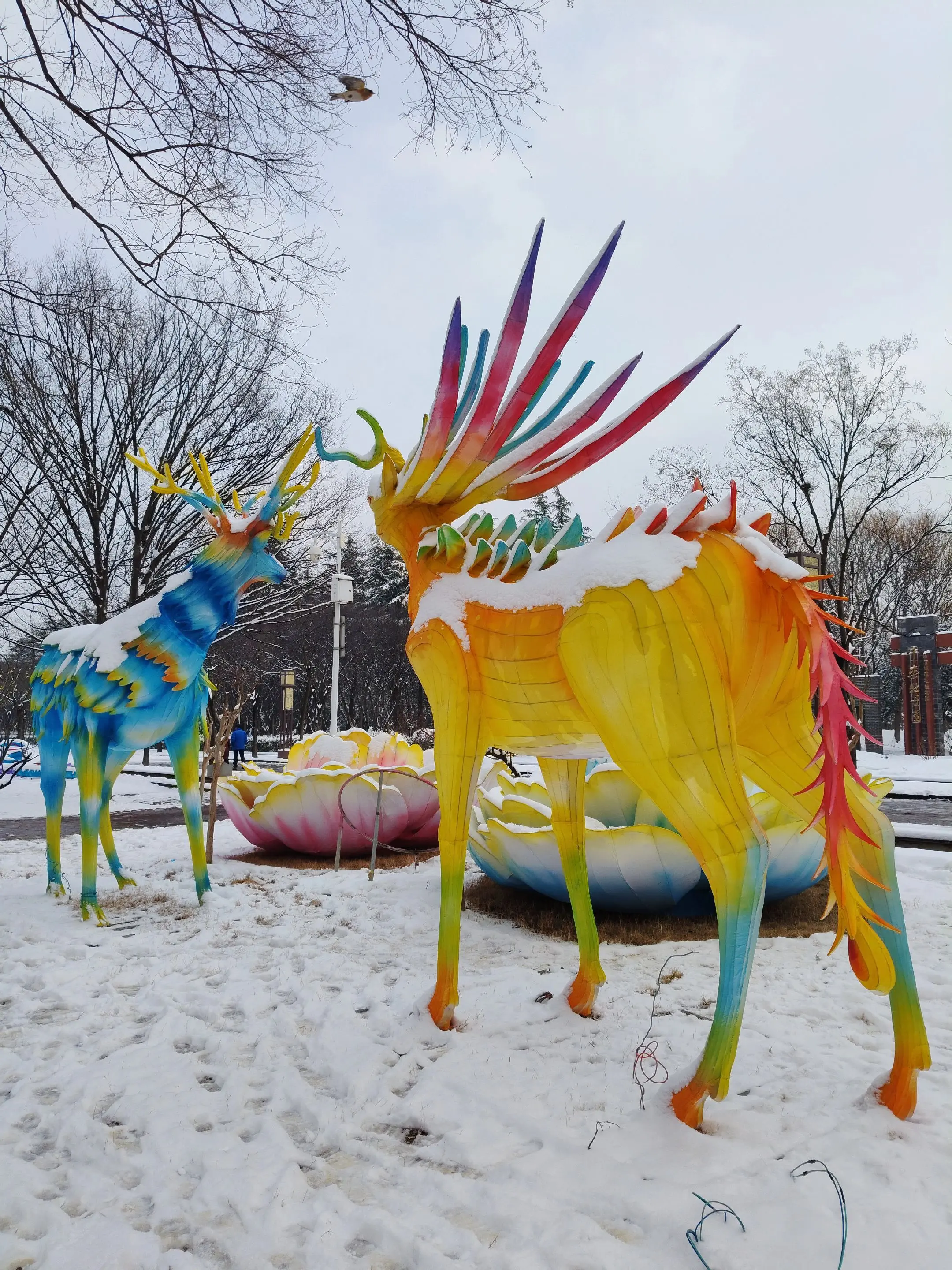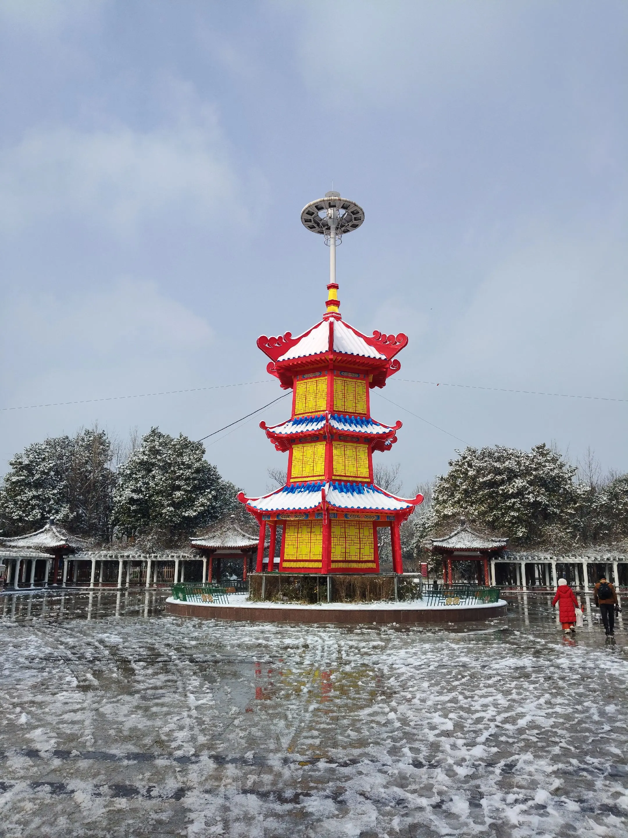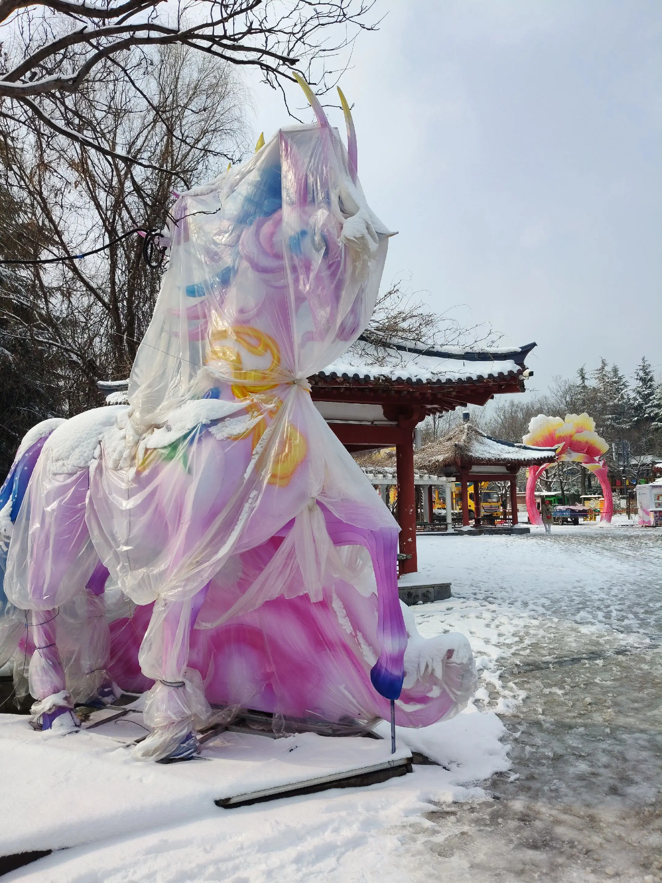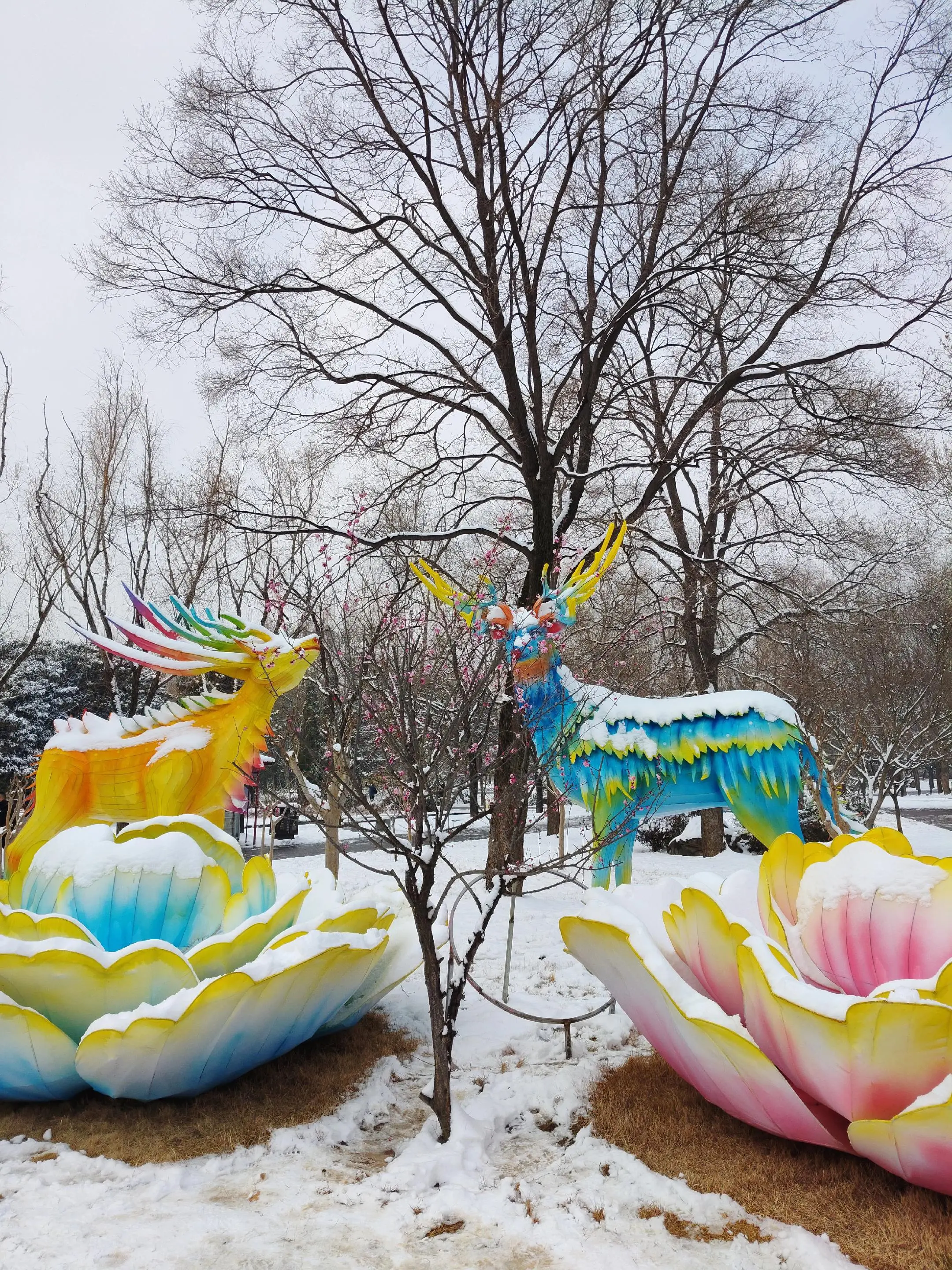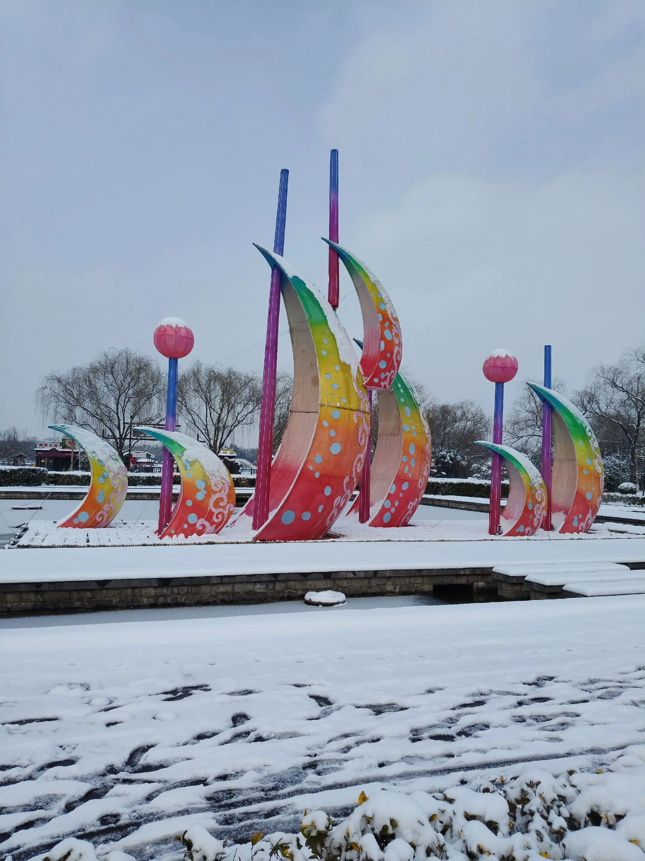 雪中隋唐植物园靓又美。 雪中的隋唐洛阳城遗址公园,白雪与彩...