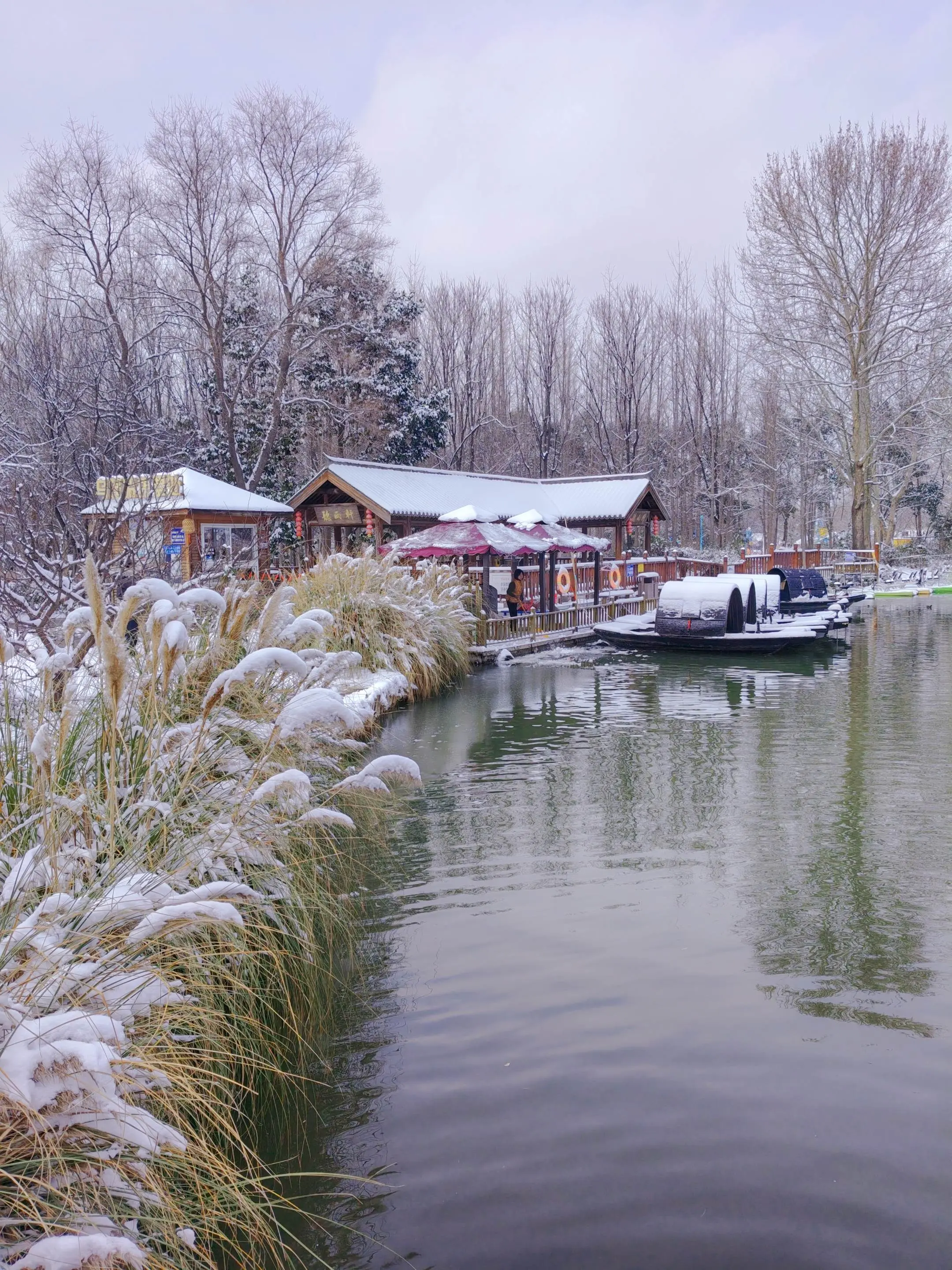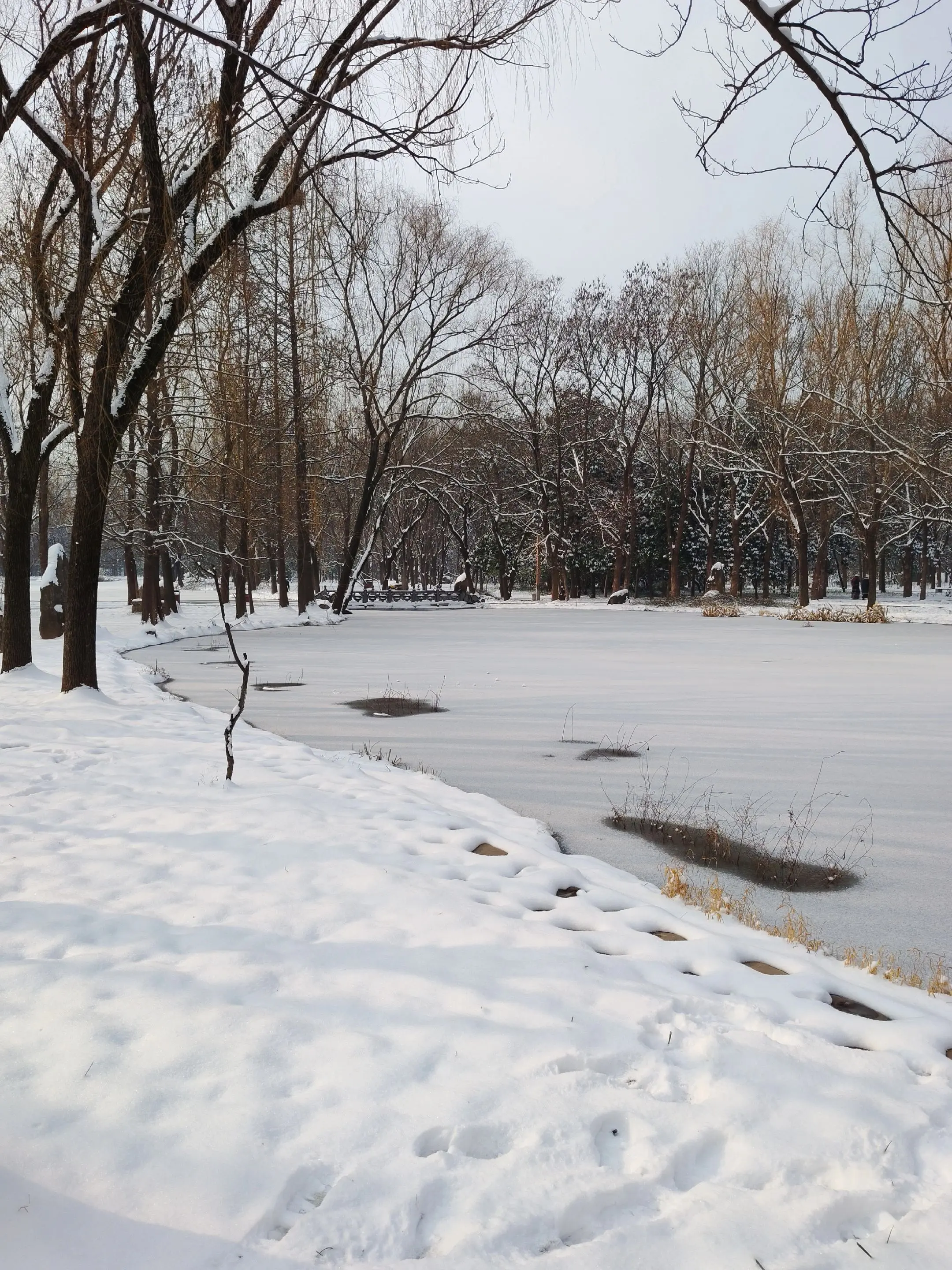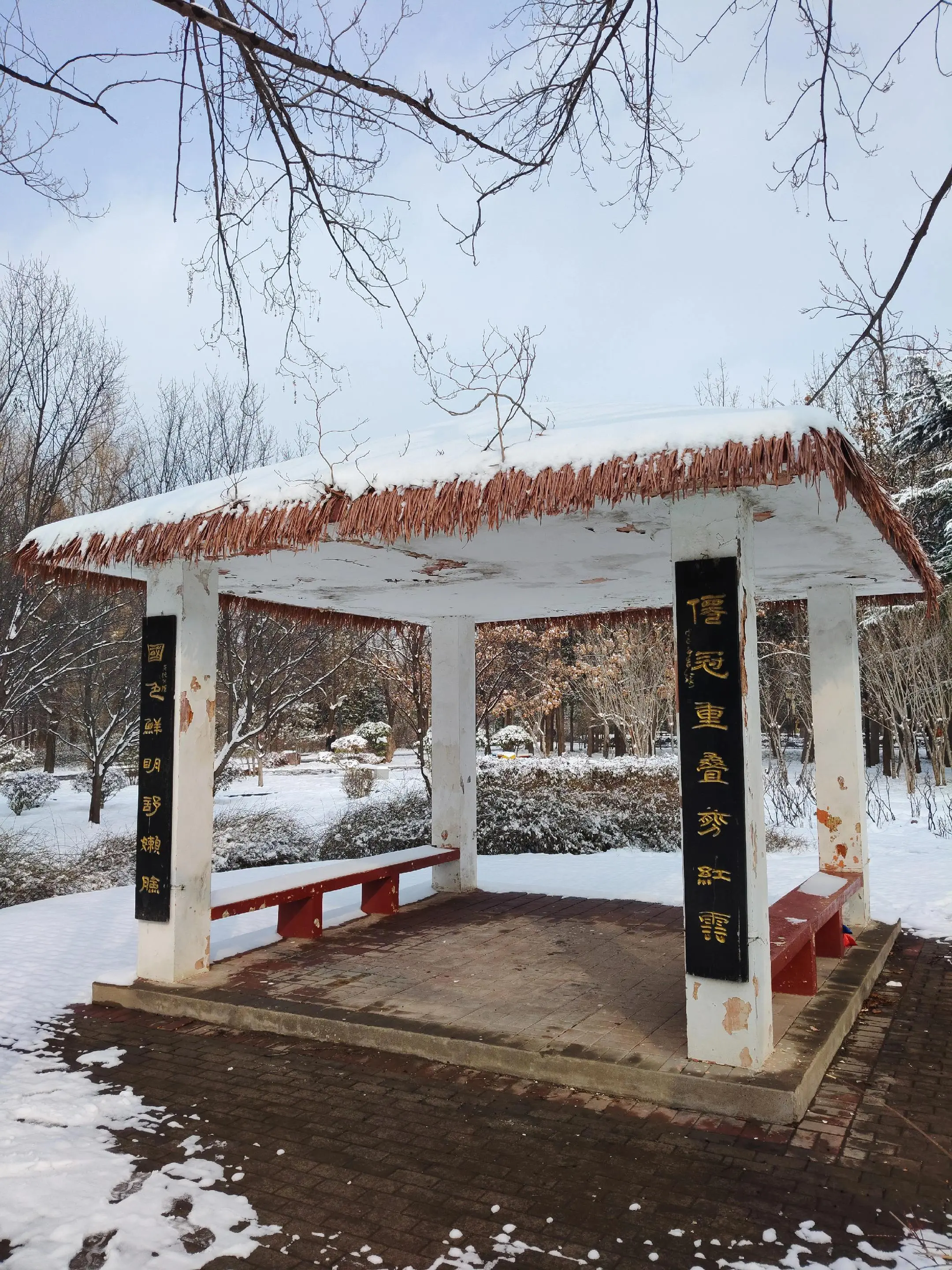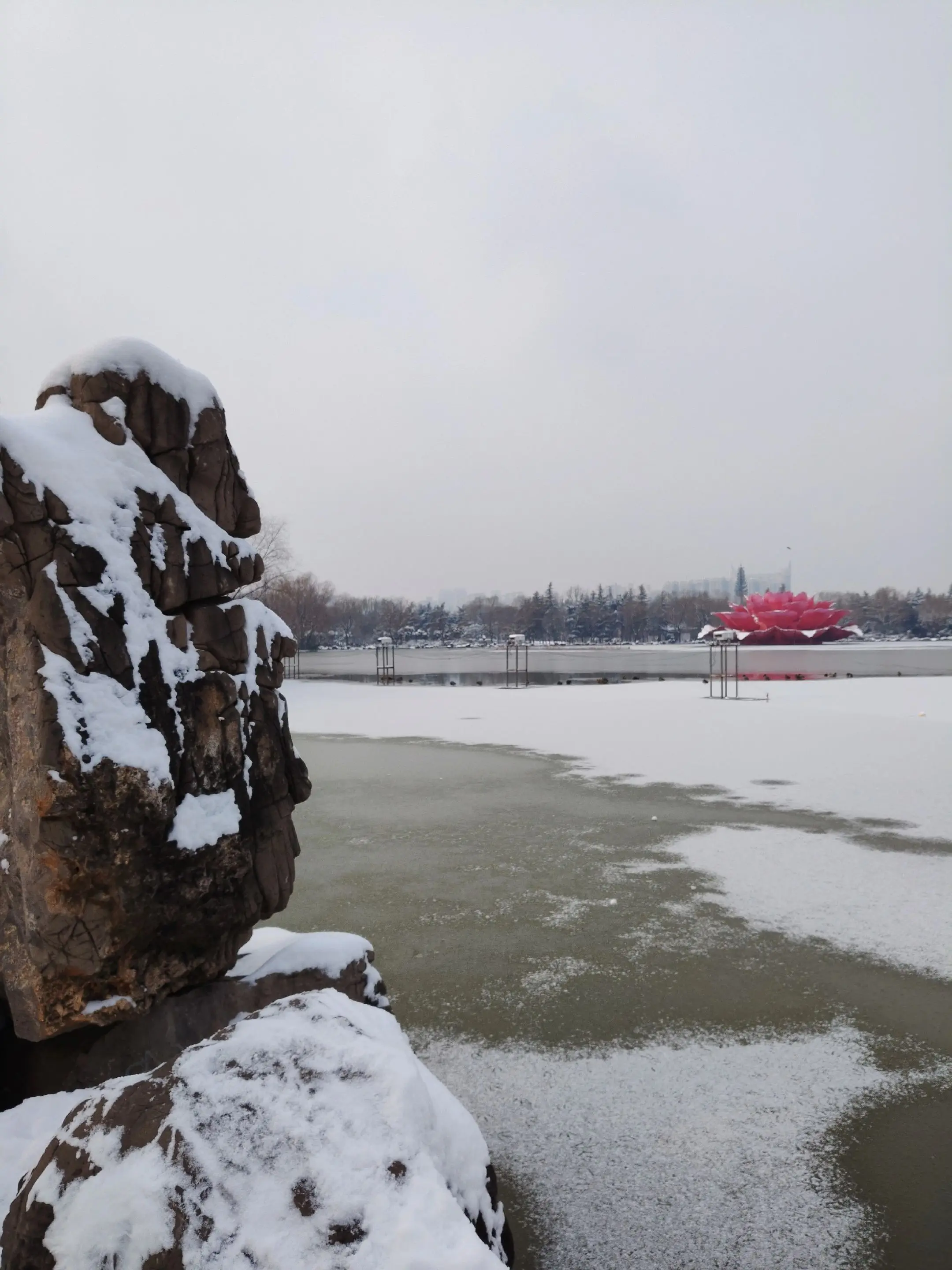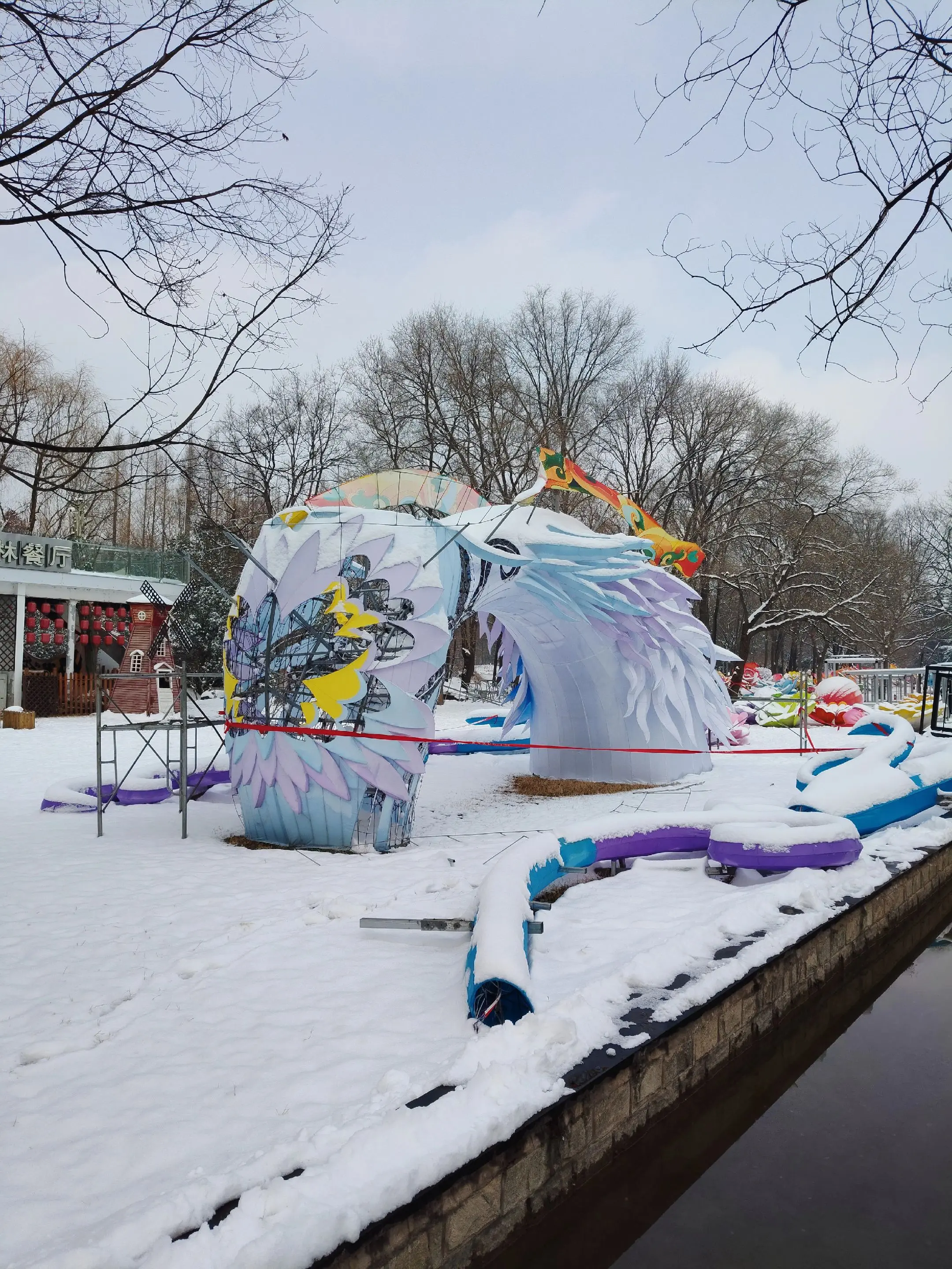 雪中隋唐植物园靓又美。 雪中的隋唐洛阳城遗址公园,白雪与彩...