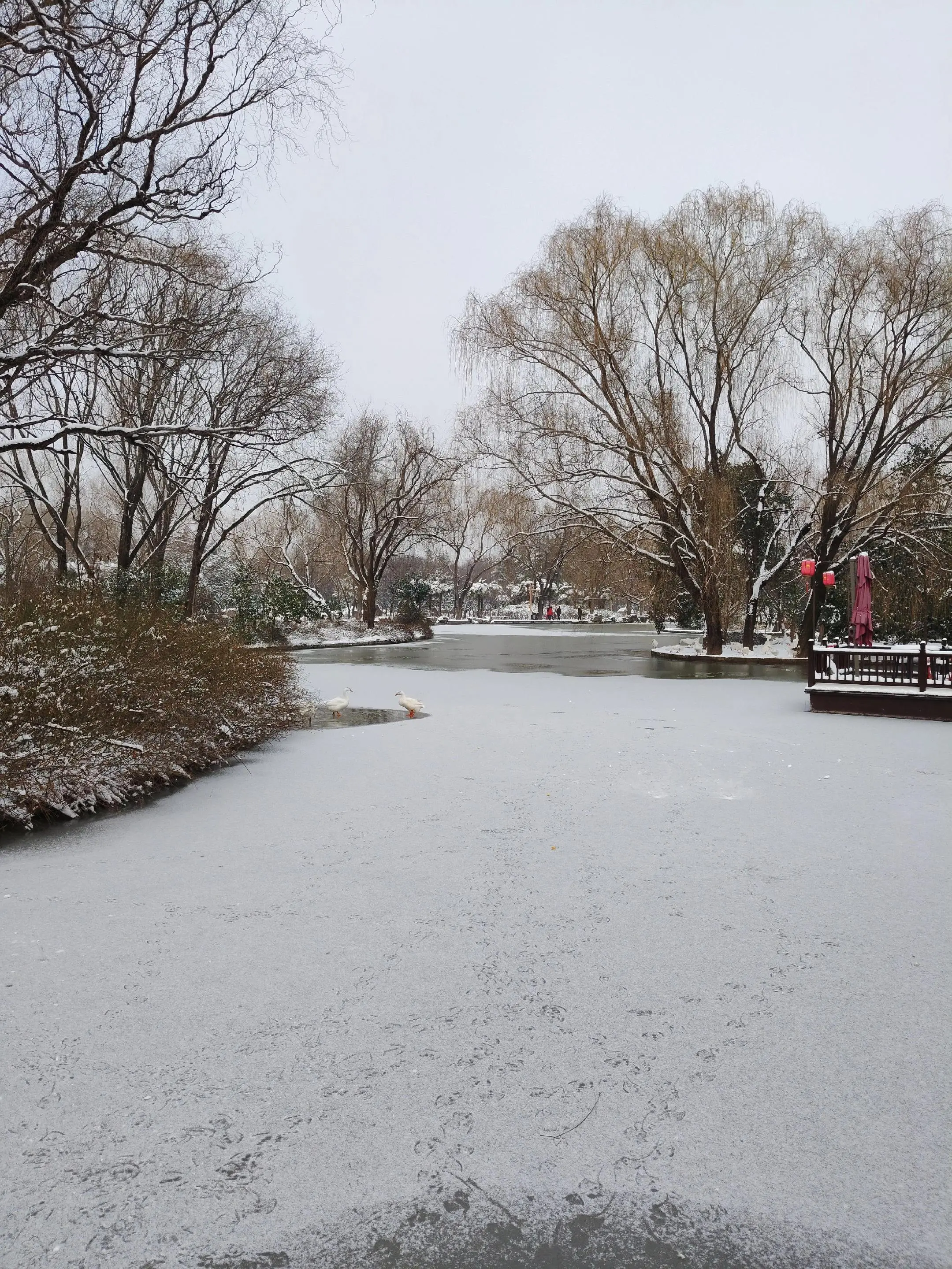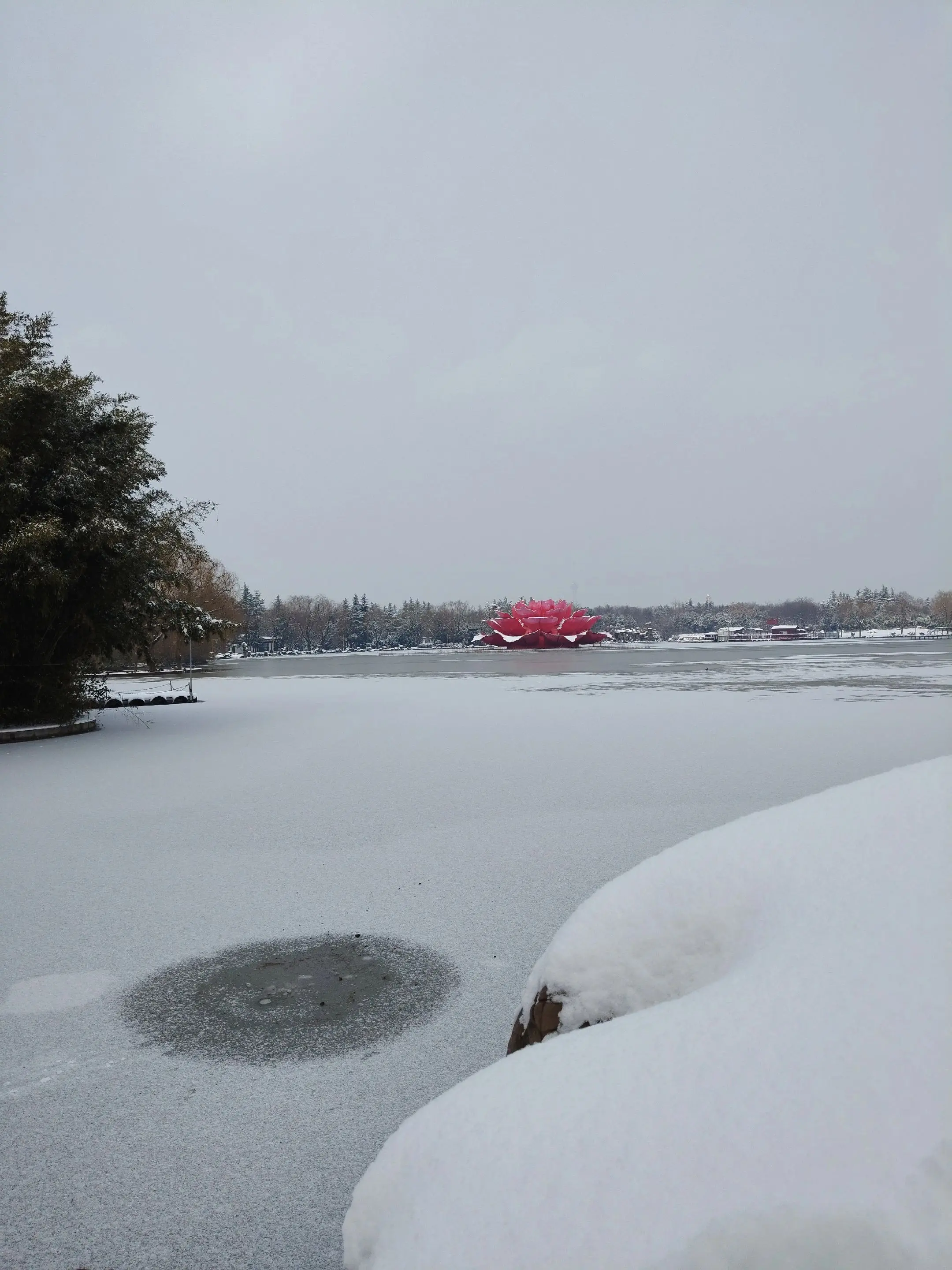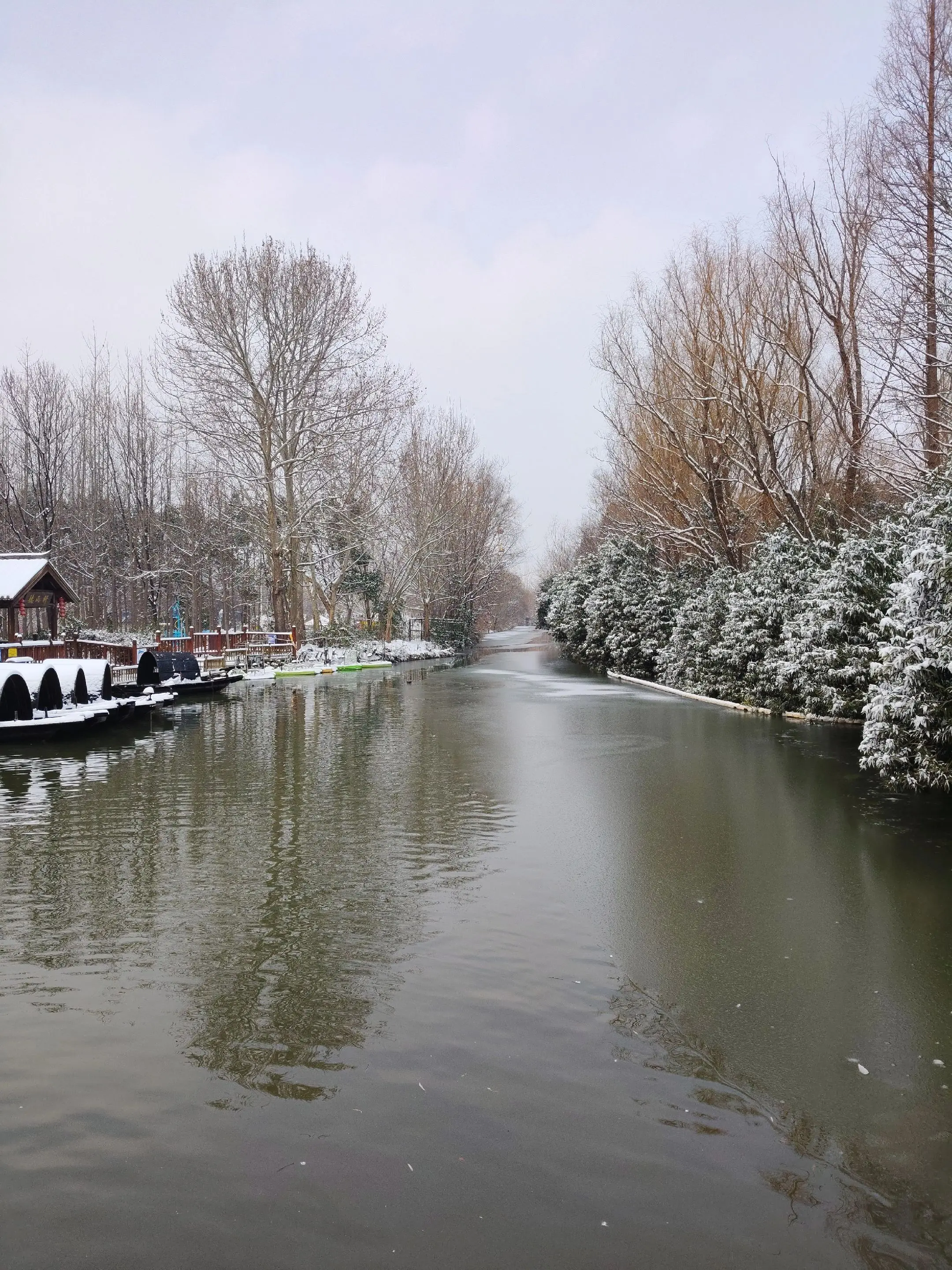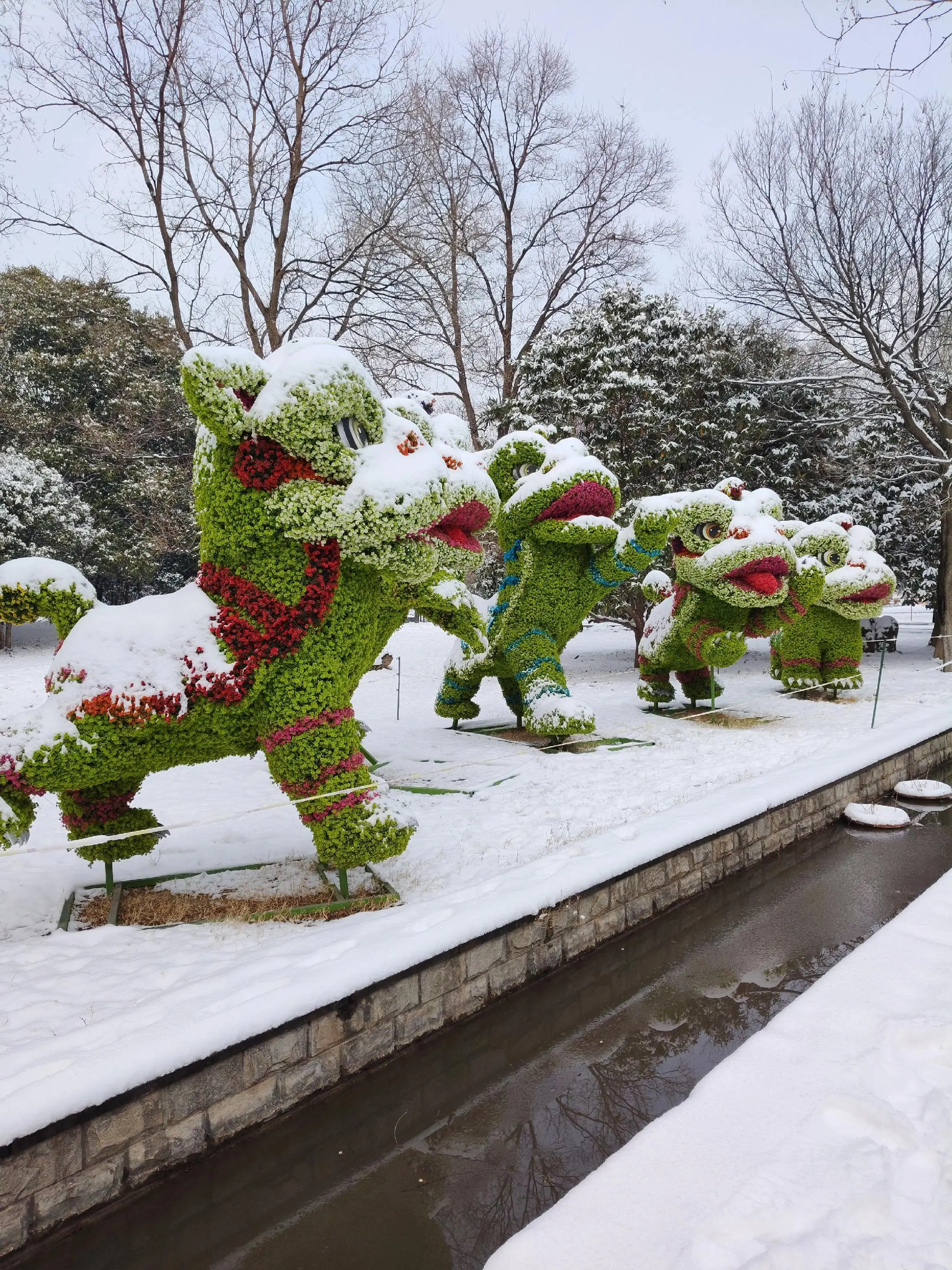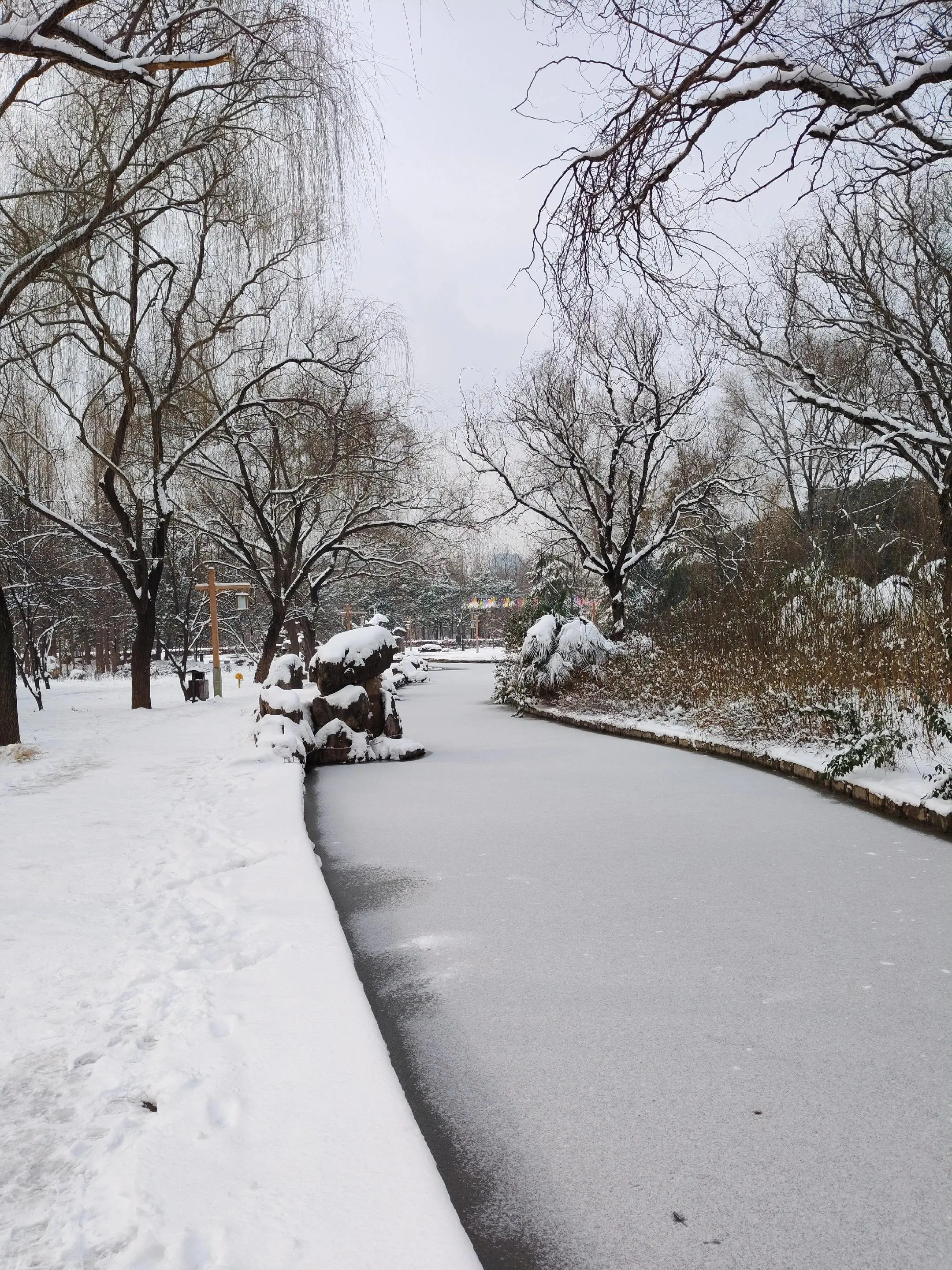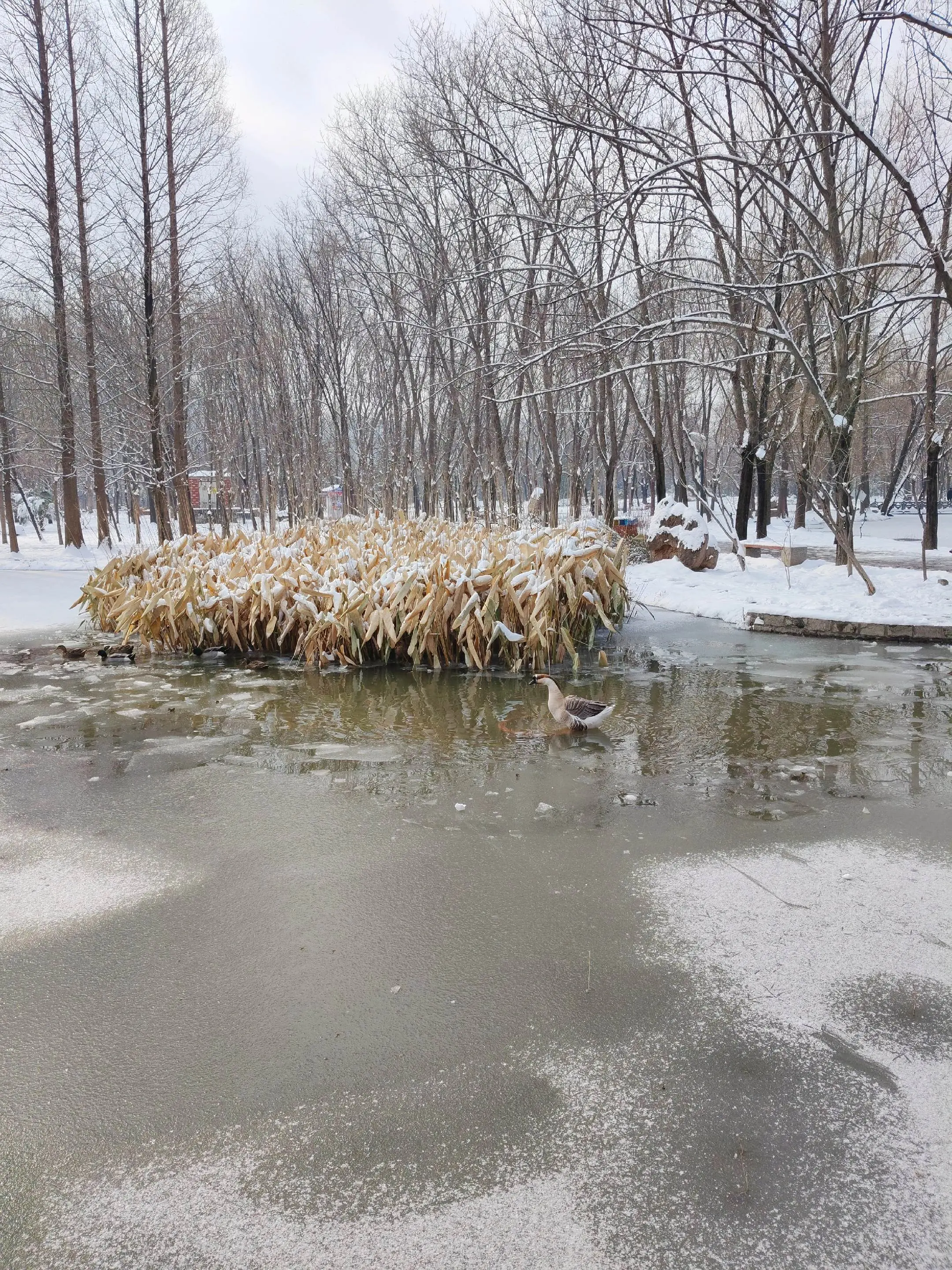 雪中隋唐植物园靓又美。 雪中的隋唐洛阳城遗址公园,白雪与彩...