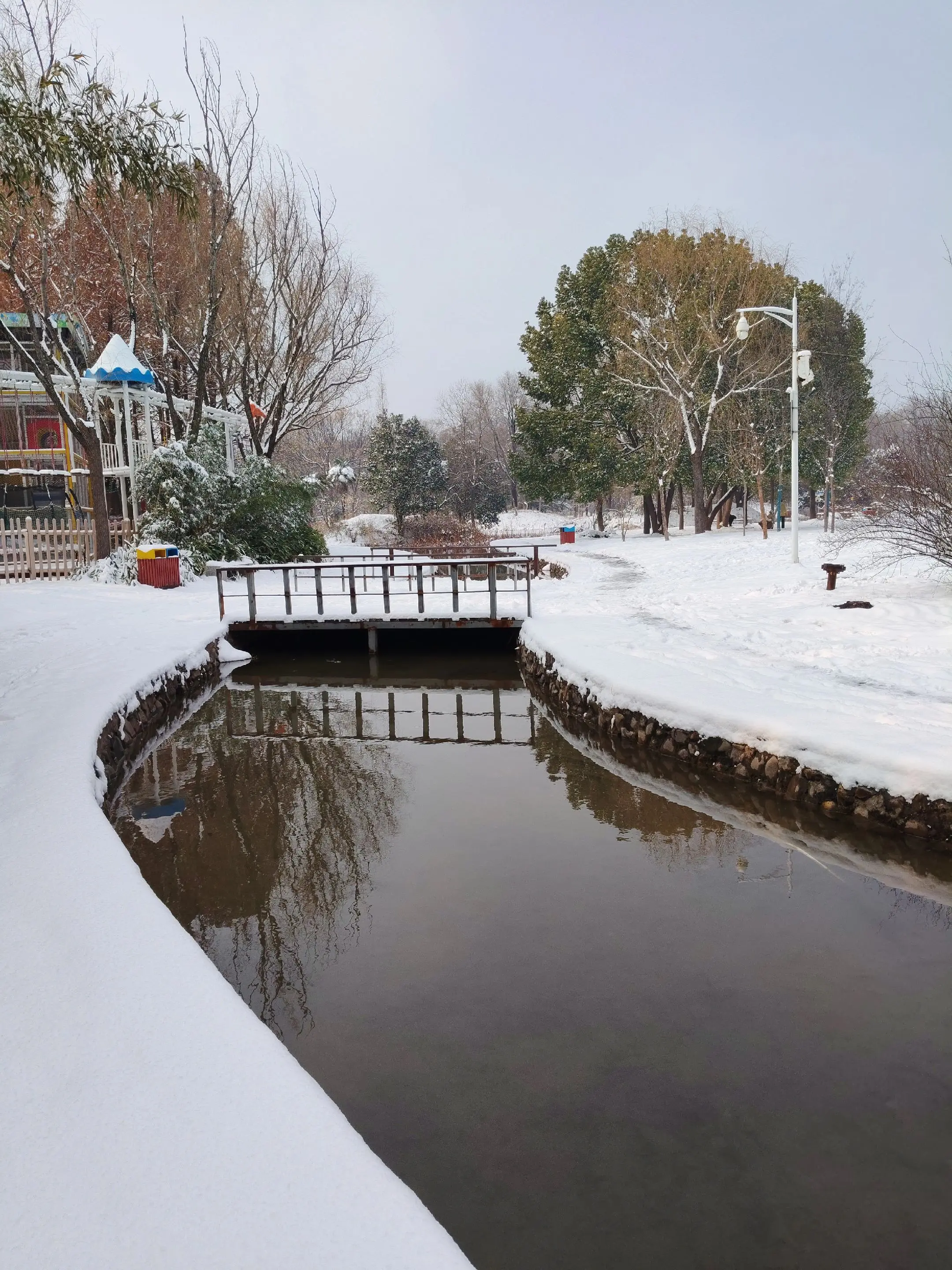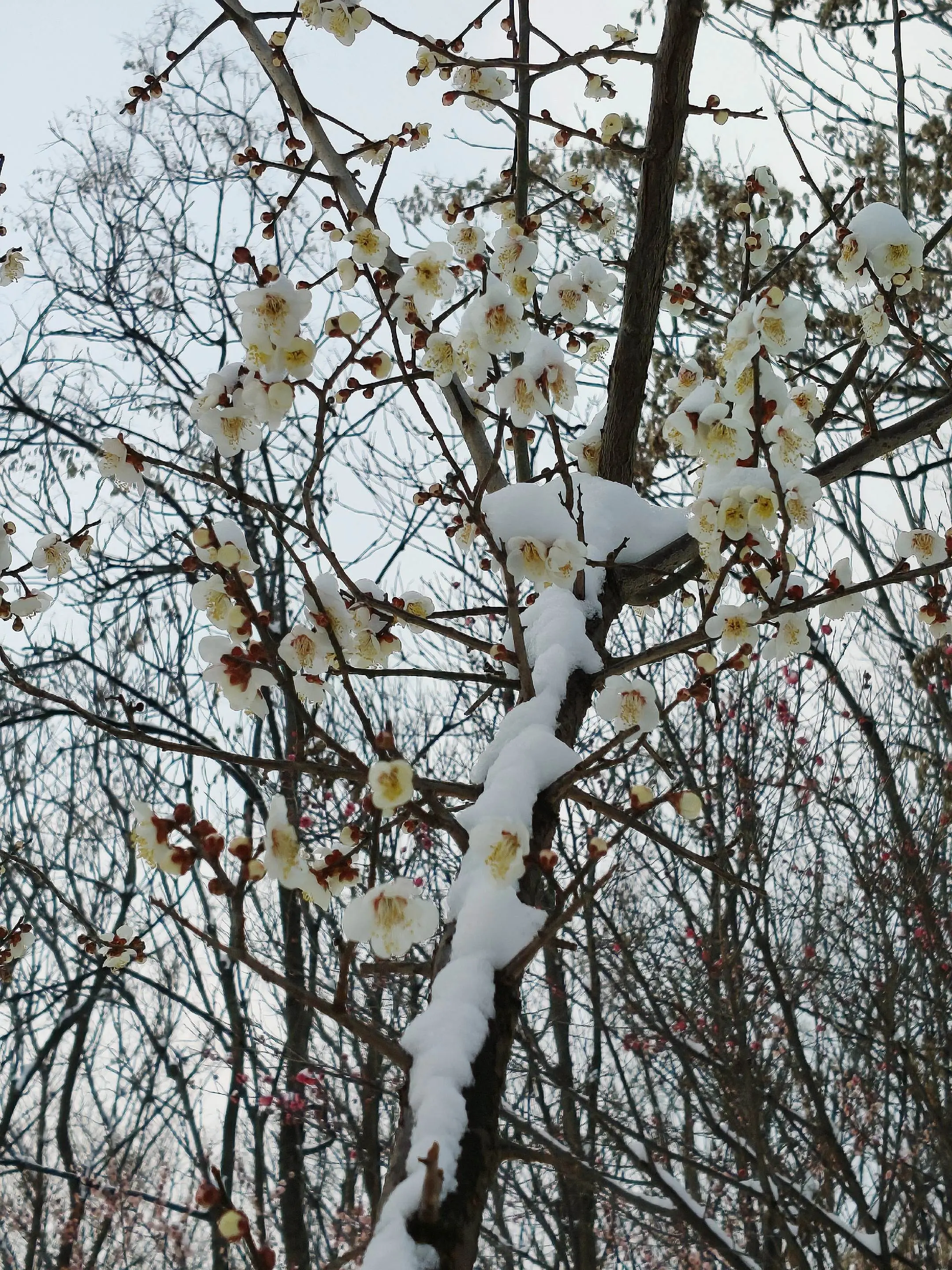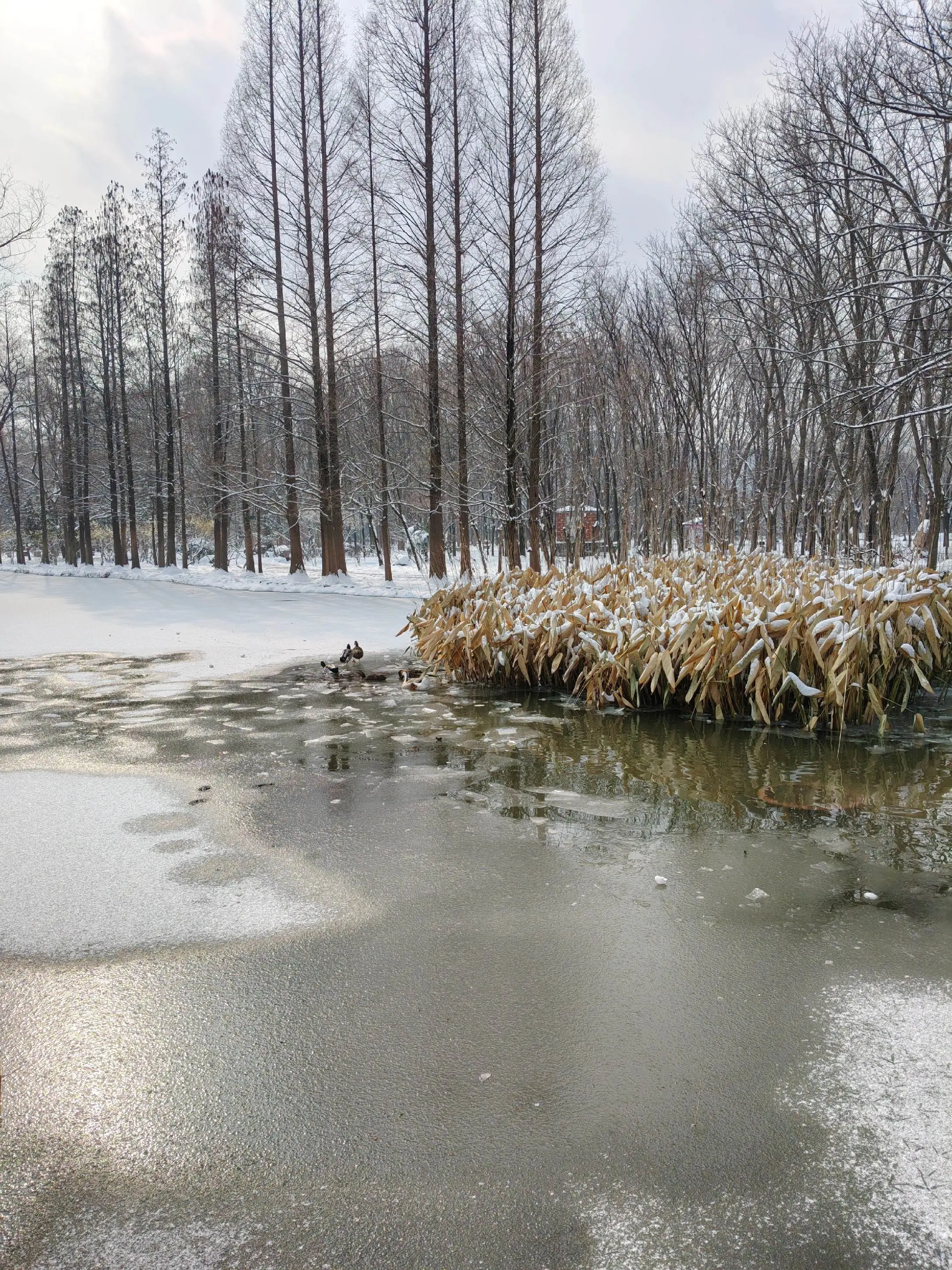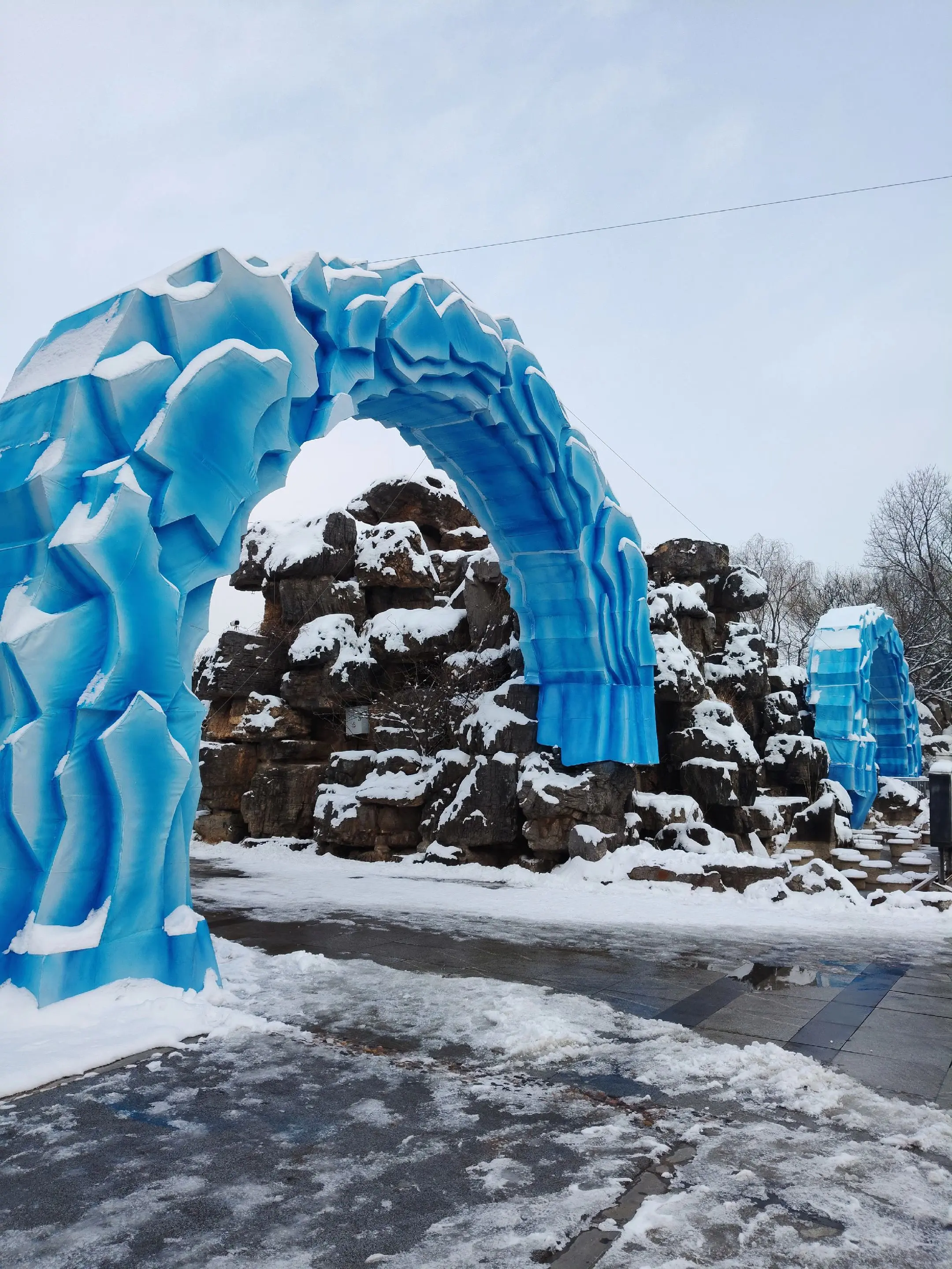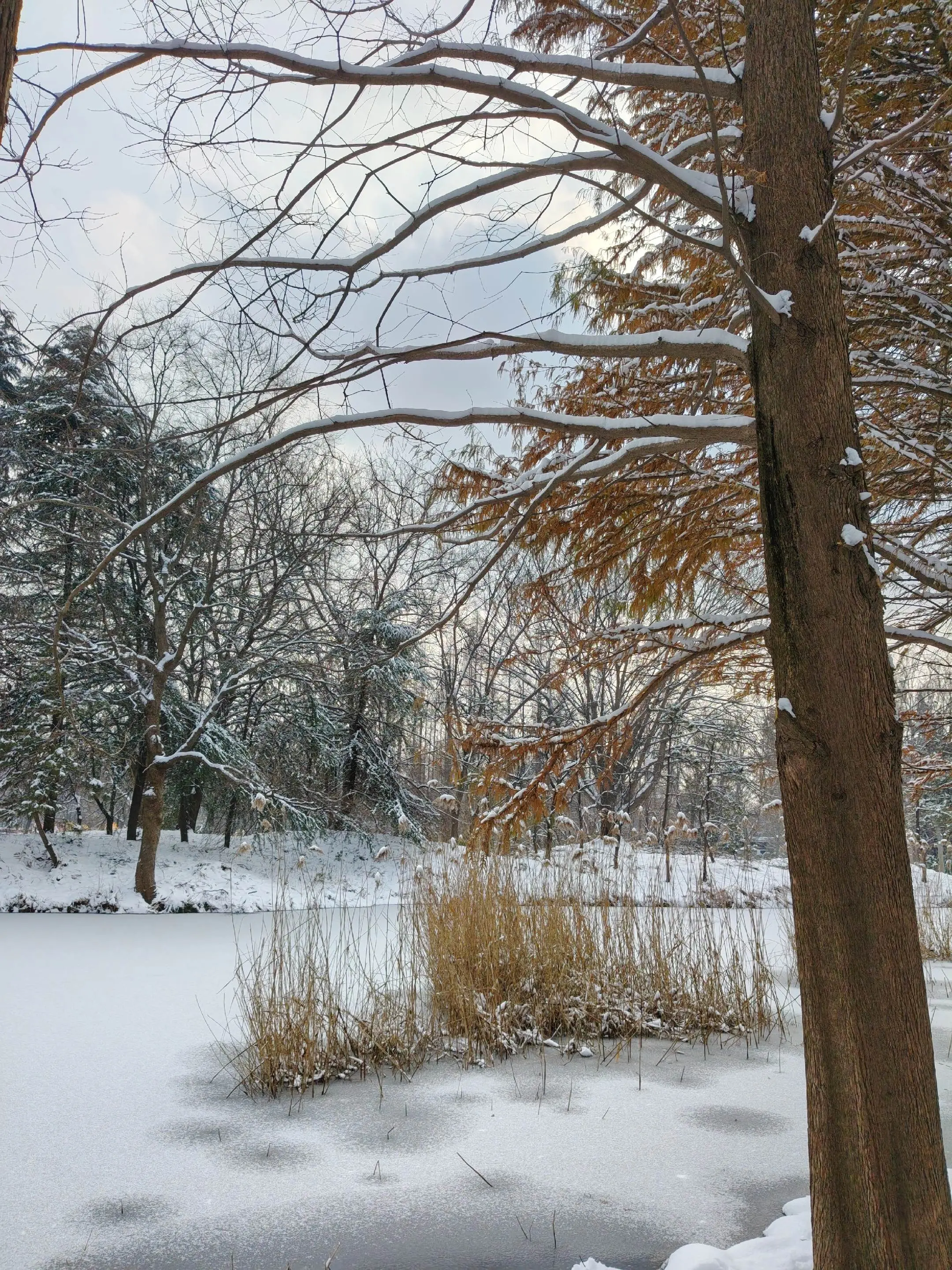 雪中隋唐植物园靓又美。 雪中的隋唐洛阳城遗址公园,白雪与彩...