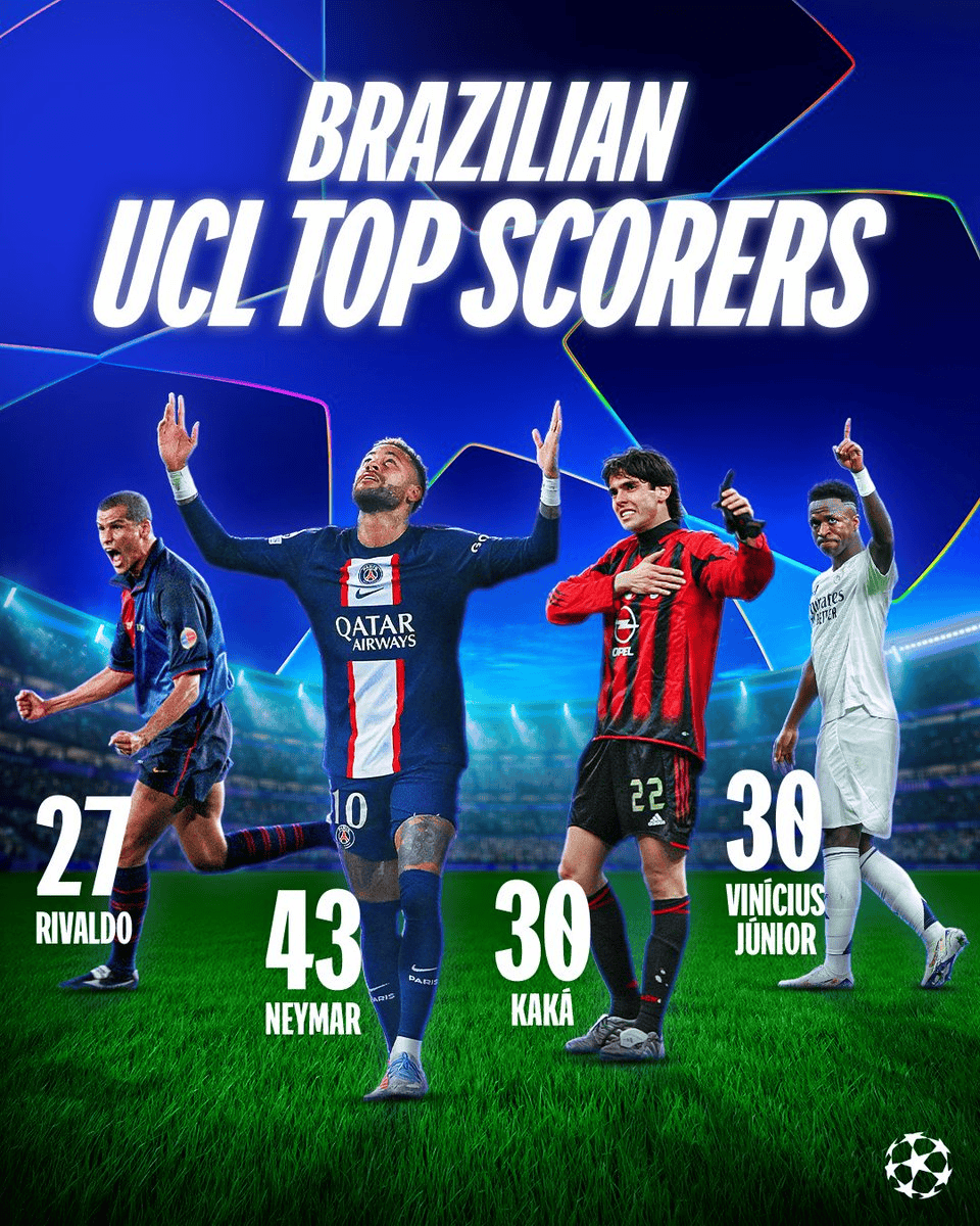 维尼修斯30球平卡卡并列巴西球员欧冠进球第二,仅次内马尔
