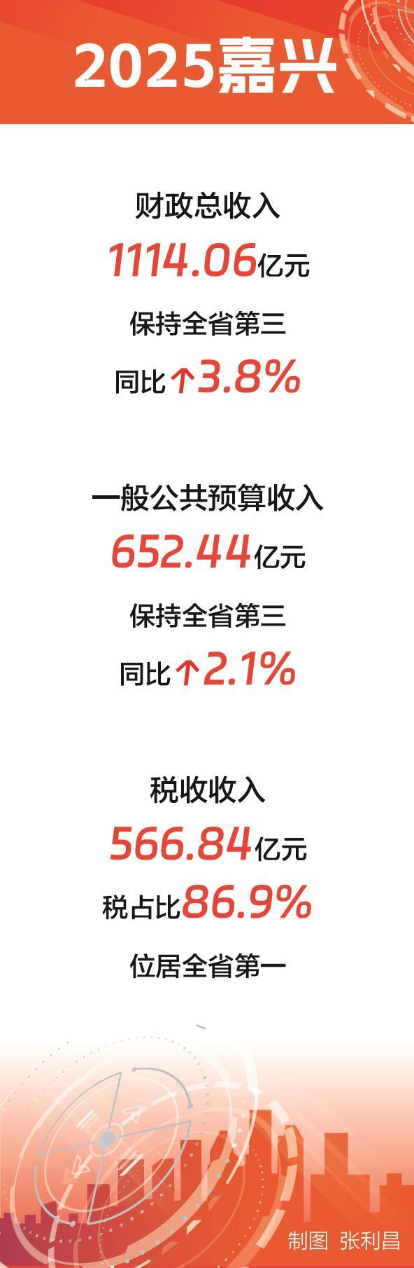 大道如砥,奋斗如歌。在不懈的拼搏中,嘉兴交出了亮眼的发展答卷——2025年,全市经济运行总体平稳,预算执行情况良好,财政总收入、一般公共预算收入分别达到1114.06亿元和652.44亿元,均位列全省第三。值得一提的是,税收收入566.84亿元,税占比86.9%,居全省第一,彰显出经济发展的韧性与活力。