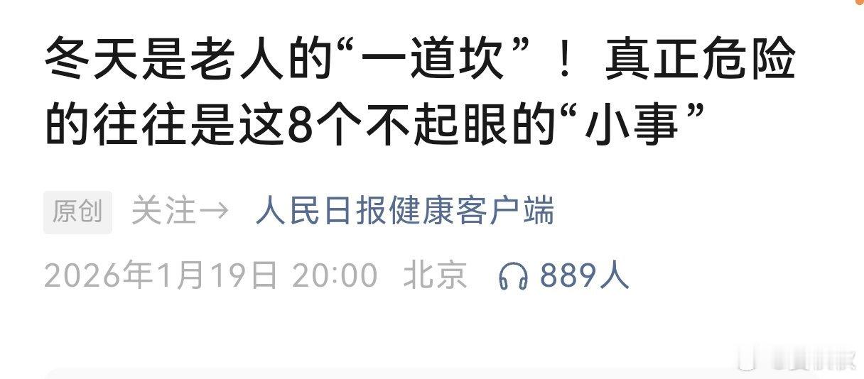 “收人”的天气这两天,你的朋友圈,有没有“老人离世”的消息?我的朋友圈里,不少。有影星、相声演员,也有普通老百姓。大寒小寒,冻死老汉。这天气,是“收人”的天气。冬天,是老人的“一道坎”。根据“人民日报健康客户端”,随着年龄增长,老年人器官功能衰退、体温调节和耐寒能力下降,加之营养不足等,很多疾病易在冬季被诱发或加重。比如心脑血管疾病,呼吸道疾病,老寒腿,拉肚子,意外摔倒,皮肤干燥,下肢静脉血栓等。而这些问题,其诱因往往就隐藏在不起眼之处。对于老年人而言,要注意以下这些生活细节。第一,防寒保暖。老年人在冬季,一定要注意防寒保暖。到人员密集的场所时要注意佩戴口罩,家里要定期通风。第二,监测血压。冬季高血压患者要密切监测血压变化,如出现持续血压增高时,应及时就医。第三,合理饮食。一日三餐要做到荤素搭配,多吃温补的食物,以及优质高蛋白食物(如瘦肉、鸡蛋、牛奶等)以补充营养,增强身体御寒能力。在心功能允许的情况,应注意多饮水,保持大便通畅。第四,多晒太阳。多晒太阳,既可以避免过度的寒冷刺激,紫外线又能够为身体补充维生素D,可以增强体质。第五,调节情绪。冬季气候阴冷,老年人容易发生抑郁、焦虑等不良情绪。因此要注意保持乐观的心态和愉快的情绪,多参与社会活动,多与家人交流,每天保持充足的睡眠。第六,皮肤保养。老年人在冬季应避免频繁洗澡,同时每天用润肤产品的缓解皮肤的干燥、瘙痒。第七,预防跌倒。老年人在下雪天尽量避免外出,平时外出时应穿防滑鞋。“收人”的天气大面积寒潮强冷空气晏秋秋
