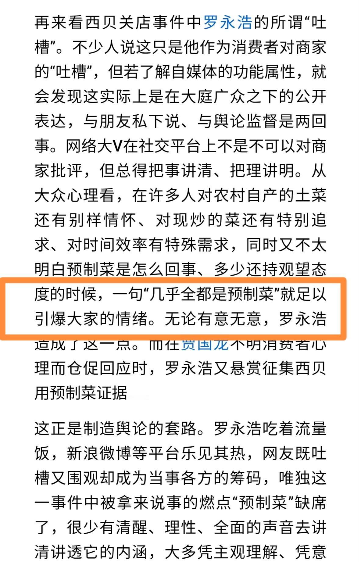 人民日报三评西贝事件。 人民褒贬不一。 个人觉得有前面两篇就好了,这第三篇感觉就是让人民日报站队去了。 先说结论: 1️⃣自媒体当然不该造谣诽谤。 2️⃣社会需要百家争鸣。上层不该只选好听的听,也该听听不同的声音。不该把不同声音统统归到造谣。 针对人民日报第三次评论西贝事件的内容。 第一,赞成部分。 自媒体,尤其是一些大V。不该造谣,不该以讹传讹。应该摆证据,讲法律。 但是,不应该把罗永浩归到造谣抹黑,“网络黑嘴”这一类。 第二,不赞成部分。 西贝事件引爆点应该是“西贝老总开放厨房”。大众睽睽之下,什么转基因大豆油啊,什么鸡汤包啊,等等。 【头条有事件脉络可查。】 所以这起事件,并不是罗永浩有多大错误,主要错误是西贝做了太多。 罗永浩作为消费者,试图去寻求自己的消费者合法权益,没毛病。 西贝餐厅事件 人民日报三评西贝事件:自媒体不可肆意