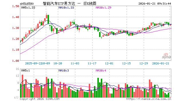 1月21日,智能汽车ETF易方达(516590)开盘跌0.53%,报1.318元。智能汽车ETF易方达(516590)重仓股方面,宁德时代开盘涨0.67%,比亚迪跌0.77%,立讯精密跌1.41%,汇川技术跌0.29%,亿纬锂能跌0.50%,豪威集团跌0.72%,三花智控跌1.40%,长城汽车跌0.32%,拓普集团跌0.55%,科大讯飞跌1.02%。