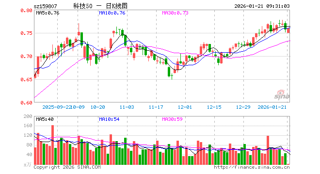 1月21日,科技ETF易方达(159807)开盘跌0.92%,报0.750元。科技ETF易方达(159807)重仓股方面,中际旭创开盘涨0.21%,恒瑞医药涨0.02%,寒武纪跌0.57%,中芯国际跌1.02%,海光信息涨3.65%,澜起科技涨0.70%,京东方A跌0.22%,迈瑞医疗跌0.05%,中兴通讯跌0.98%,兆易创新涨1.03%。