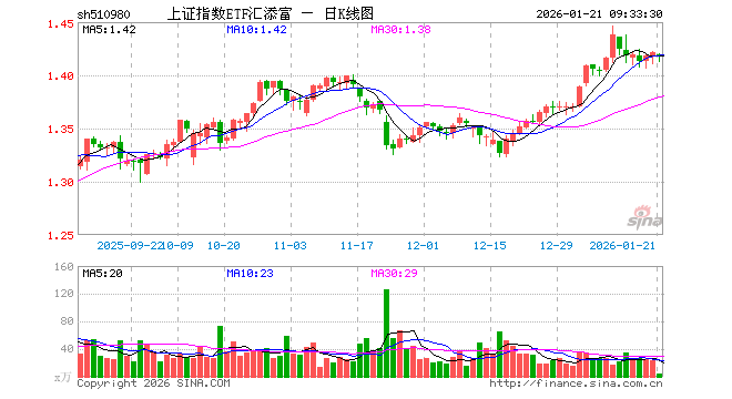 1月21日,上证指数ETF汇添富(510980)开盘跌0.14%,报1.419元。上证指数ETF汇添富(510980)重仓股方面,农业银行开盘涨0.14%,贵州茅台涨0.00%,中国银行涨0.00%,中国石油涨0.40%,工业富联跌1.61%,招商银行涨0.49%,中国人寿涨0.00%,长江电力涨0.04%,寒武纪跌0.57%,中国神华涨0.32%。