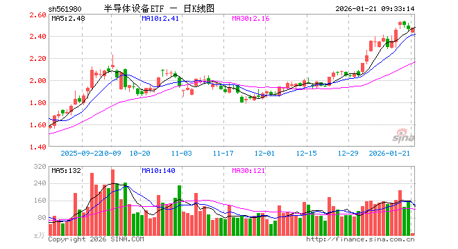1月21日,半导体设备ETF(561980)开盘跌1.38%,报2.427元。半导体设备ETF(561980)重仓股方面,中微公司开盘跌0.09%,北方华创跌0.24%,寒武纪跌0.57%,中芯国际跌1.02%,海光信息涨3.65%,长川科技涨0.15%,华海清科跌0.79%,拓荆科技跌1.08%,南大光电跌2.73%,安集科技跌1.59%。