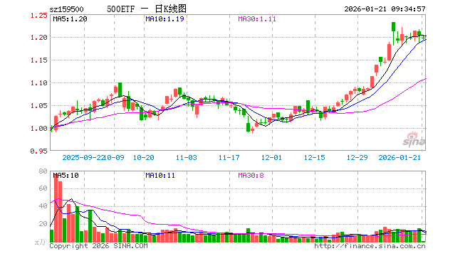 1月21日,500ETF(159500)开盘跌0.42%,报1.197元。500ETF(159500)重仓股方面,胜宏科技开盘跌0.24%,华工科技跌1.10%,润和软件跌0.83%,指南针跌0.35%,芯原股份跌1.22%,四川长虹跌1.42%,巨人网络跌0.02%,东吴证券跌0.43%,菲利华跌0.31%,天风证券跌0.24%。