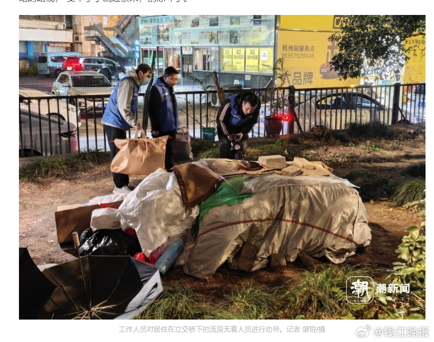 【 #冰雪夜杭州默默守护流浪者# 】0℃,这是1月20日晚上七点半的气温,杭州飘着淅淅沥沥的雪粒。这是2026年杭州主城区迎来的第一波寒潮。从去年11月初开始,杭州市救助管理站就启动“寒冬送温暖”专项救助行动,劝导街头流浪无着人员前往救助站。尤其是在这种气温骤降的日子,杭州市救助管理站会联合属地街道、公安、城管等多部门开展联合巡查,并提高巡逻频次,“他们都是暂时遇到困难的人,我们要确保他们可以安全度过寒夜。”在火车站附近的一个转角,记者跟随工作人员遇到了来自山西洪洞的林红(化名)。他喝了两口酒暖暖身子,因此带着淡淡酒气。在靠近花坛处,一个行李箱、一把雨伞,一卷薄薄的铺盖——这就是林红简单的“家”。1994年出生的林红,去年7月来到杭州,他一直在老家做装修,挣得少,就想着来杭州试试。起初他在萧山区找到一份电焊的工作,可仅仅干了四五个月,就因和老板关系不和而离职,之后他就来到了火车站附近找工作。从去年12月初到现在,林红找过两份短工,可一直没有找到合适的长期工作。更不巧的是,他和工友们吃饭时,因为贪杯弄丢了手机。“这个天气睡在这里太危险了,跟我们去救助站吧。”顶着寒风,三名市救助管理站的工作人员轮番劝导,但林红很固执,“我要在这里找工作的,不去。”临近春节,不少工厂都开始慢慢停工放假了,工作人员说,“要不,我们给你买张回家的车票吧,等过完年再回来。”林红摇了摇头,“没挣着钱,没脸回去。”劝导了15分钟无果,救助管理站的工作人员只好留下了棉被、衣物以及食物,并告知林红去救助站的路线,“受不了了就赶紧来,别冻坏了。”随后,记者又跟随工作人员去周边的涵洞、立交桥下等多地进行了巡查。工作人员告诉记者,现在杭州街头流浪无着的人员,整体数量是在减少的,但也有一些和林红一样,因找工作困难、身上资金又耗尽了,就在街头凑合的人,“有一部分人是不愿意去救助站的,我们只能送上物资,同时让属地加强巡查,确认他们的人身安全。”工作人员介绍,愿意去站里的人都会得到“一杯热饮、一顿热饭食、一身新棉衣”的暖心服务,并且可以洗热水澡、睡个温暖觉,“对于愿意返乡的,我们也会帮忙购买户籍地的车票。”这两天寒潮来袭,杭州市救助管理站始终保持24小时运营。工作人员提到,站内求助人员来来去去,总量保持在20人左右,其中也有些老面孔。“有一位户籍地在黑龙江的李大哥,50多岁,是站里的常客。”工作人员提到,去年年初的巡查中就发现了李大哥,并将其劝导到了站里,“我们第一时间就进行了寻亲,但李大哥的亲人基本都不在了。”在李大哥表达了更愿意留在杭州的意愿后,工作人员在提供救助的同时,也帮他留心合适的工作,“有工作时他就走了,要是再遇到困难了,他又会选择回来。”举目无亲的情况下,救助站像是李大哥最后的港湾。不过,工作人员也提到,按照相关规定,受助人员最多只能连续在站内居住10天,“当然对于实在困难的群众,我们会酌情安排,并考虑联系公益组织进行妥善安置。”当巡查结束,再次遇到林红的时候,他刚吃完温暖大礼包里的泡面。等到天亮,他就准备继续找工作,“先花个200元,买个新手机。”临走时,这个倔强的年轻人终于笑了,他说,“希望还有机会见面,下次应该不会这么狼狈了。”在这里,也呼吁广大市民群众,如果您在街面发现流浪乞讨人员或外地在杭临时陷入困境人员,请及时拨打110报警电话,也可以引导其前往杭州市救助管理站或就近的救助管理站寻求救助。(潮新闻 记者 盛锐 通讯员 潘辉)#牢A#