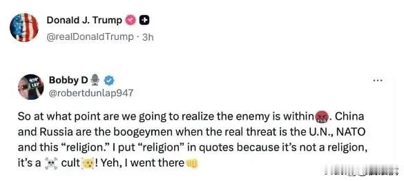 清醒的人 特朗普总统是美国历任总统中较清醒的一个。他在20日推特上发文表露了真实的想法: 美国最大的敌人不是俄罗斯和中国。说他们是威胁就是危言耸听(故意设置潜在对手提升自己话语权) 其实美国最大的敌人在自己"内部”一一北约和联合国。 在美国"有事”的时候,北约其它成员国未必能帮忙。为联合国耗费了大量的资源。这是特朗普担任总统后与世界外交中得到的最好结论,也是最正确的结论。