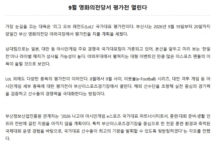最受关注的当属《英雄联盟》(LoL)国家队选拔赛。釜山计划于2026年9月19日至20日,在釜山电影殿堂的露天剧场举办为期两天的选拔赛。