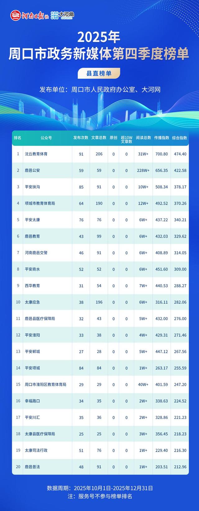 本期乡镇、县直部门综合排名较高的微信公众号依次为:沈丘教育体育、鹿邑公安、平安扶沟、项城市教育体育局、平安太康、鹿邑教育、河南鹿邑交警、平安商水、西华教育、太康应急、鹿邑县医疗保障局、平安淮阳、平安郸城、平安项城、周口市淮阳区教育体育局、幸福路口、平安川汇、太康县医疗保障局、太康司法行政、鹿邑普法。