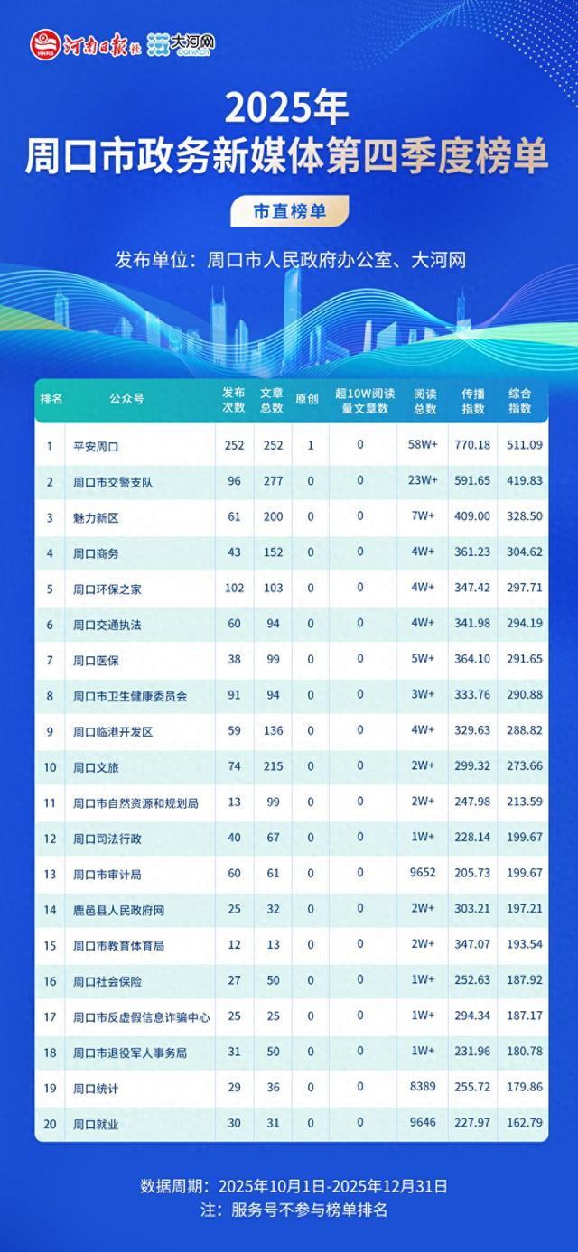 本期区县、市直部门综合排名较高的微信公众号依次为:平安周口、周口市交警支队、魅力新区、周口商务、周口环保之家、周口交通执法、周口医保、周口市卫生健康委员会、周口临港开发区、周口文旅、周口市自然资源和规划局、周口司法行政、周口市审计局、鹿邑县人民政府网、周口市教育体育局、周口社会保险、周口市反虚假信息诈骗中心、周口市退役军人事务局、周口统计、周口就业。