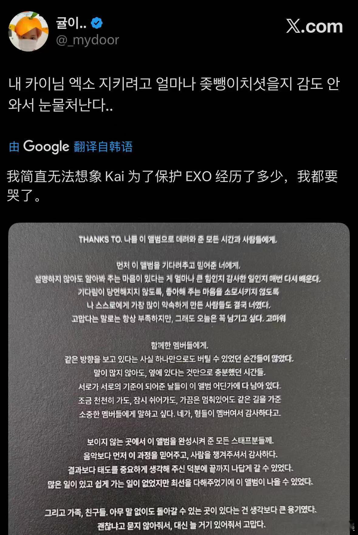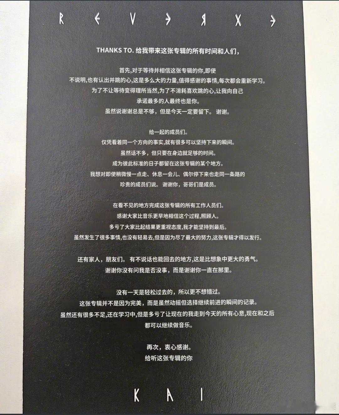 金钟仁新专致谢长文 EXOEXO 新专中致谢的部分,金钟仁金钟仁 长文表达对粉丝、成员、工作人员及家人的感谢。“不让等待变成理所当然”、“成为彼此标尺的日子都留在这张专辑的某个地方”、“再次真心感谢收听这张专辑的你”,每句话都十分用心,诚意满满。