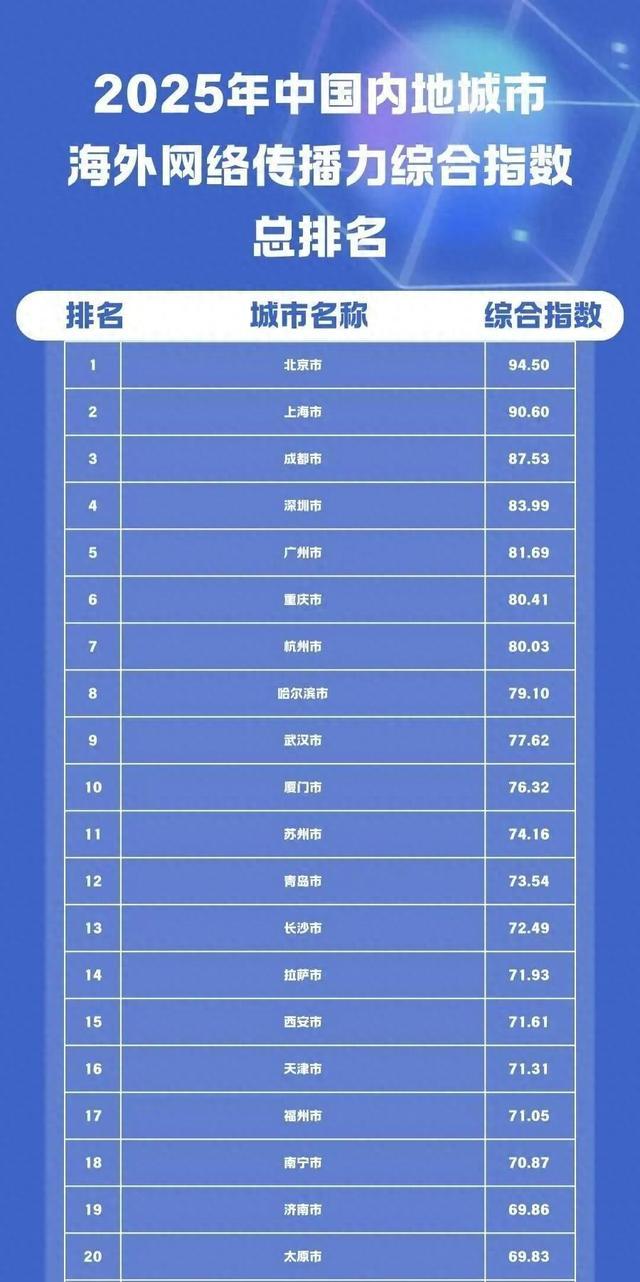 《2025中国城市、大学、央企海外网络传播力建设系列报告》,由北京师范大学新媒体传播研究中心、中国日报网、光明网和北京师范大学教育新闻与传媒研究中心联合发布。在338座内地城市海外网络传播力排名中,北京、上海、成都位列前三名,太原位列第20名。在前20名城市中,拉萨市、太原市、苏州市名次上升幅度大。