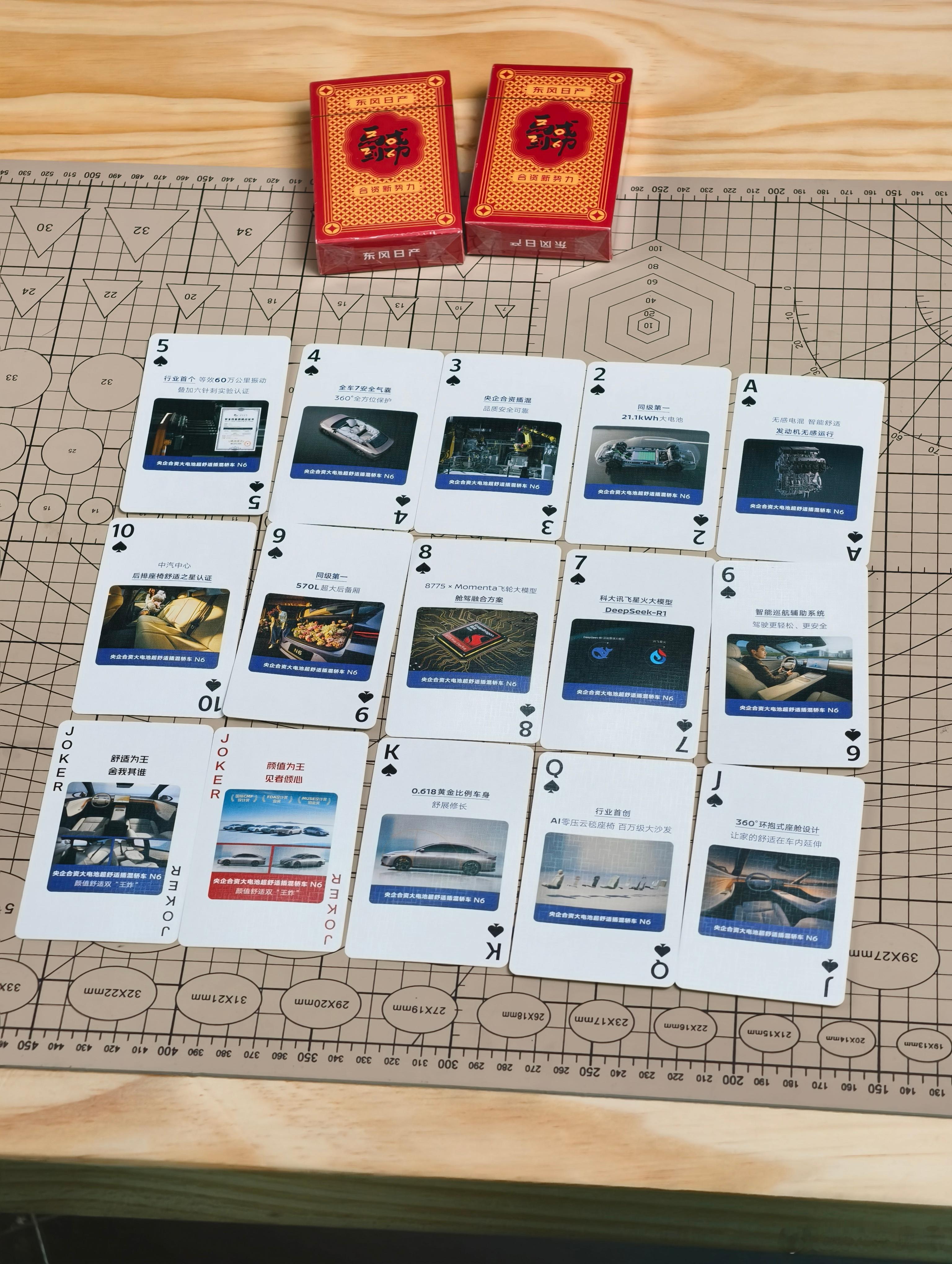 东风日产出了新的周边——扑克牌。这个时间点出扑克真的太及时了,过年可以带回家打掼蛋了。扑克上当然是印满了产品亮点,之前蔚来也这么干过,把所有自研的技术印在了扑克上,我还专门买了十几副回家。新年王炸东风日产叫地主