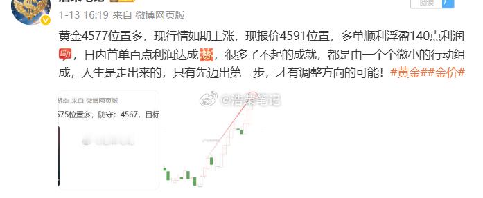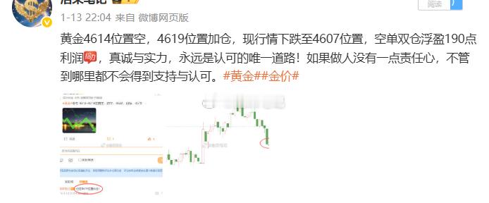 2026.1.13日周二操作记录总结!黄金4586位置多,在4595位置多单止盈90个点利润黄金4577位置多,在4591位置多单止盈140个点利润黄金4614位置空,4619位置加仓,在4607位置空单双仓止盈190个点利润博文公布3单,全胜!共收割420个点,心态决定成败。不要幻想每一笔交易都能完美无瑕,盈亏平衡,得失皆有。投资如同旅行,匆匆忙忙,充满迷惘和彷徨,只有静下心来,才能拨开眼前的云雾。黄金 金价