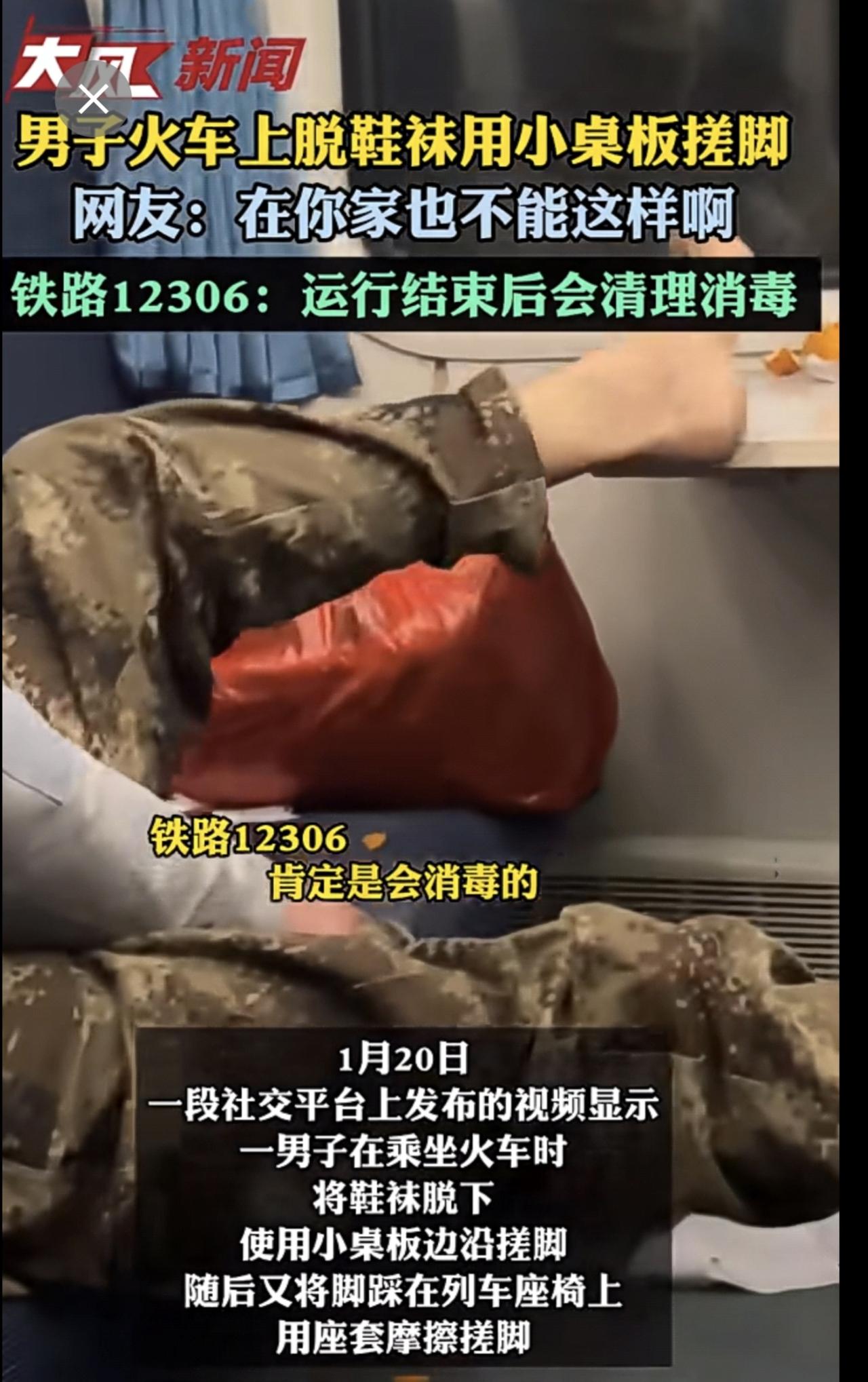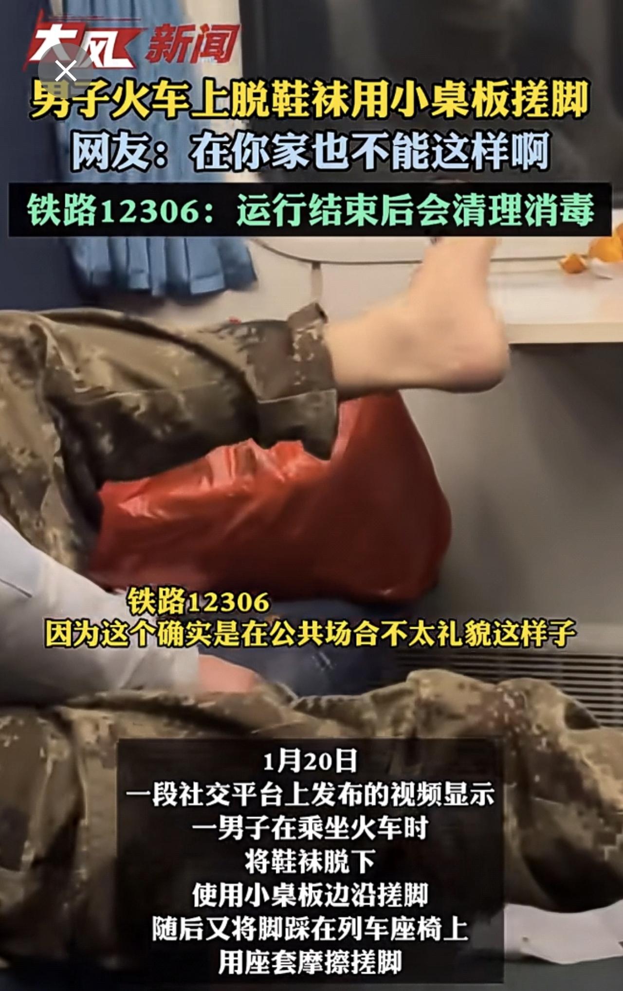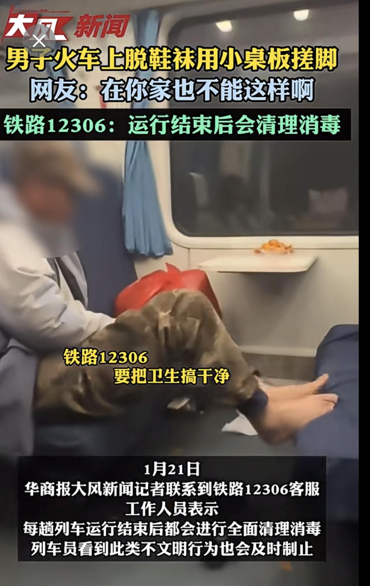男子火车上脱鞋袜用小桌板搓脚,网友惊呆:在你家也不能这样啊;铁路12306:运行结束后会清理消毒。