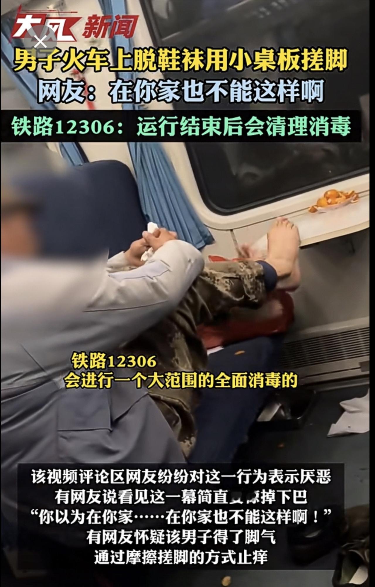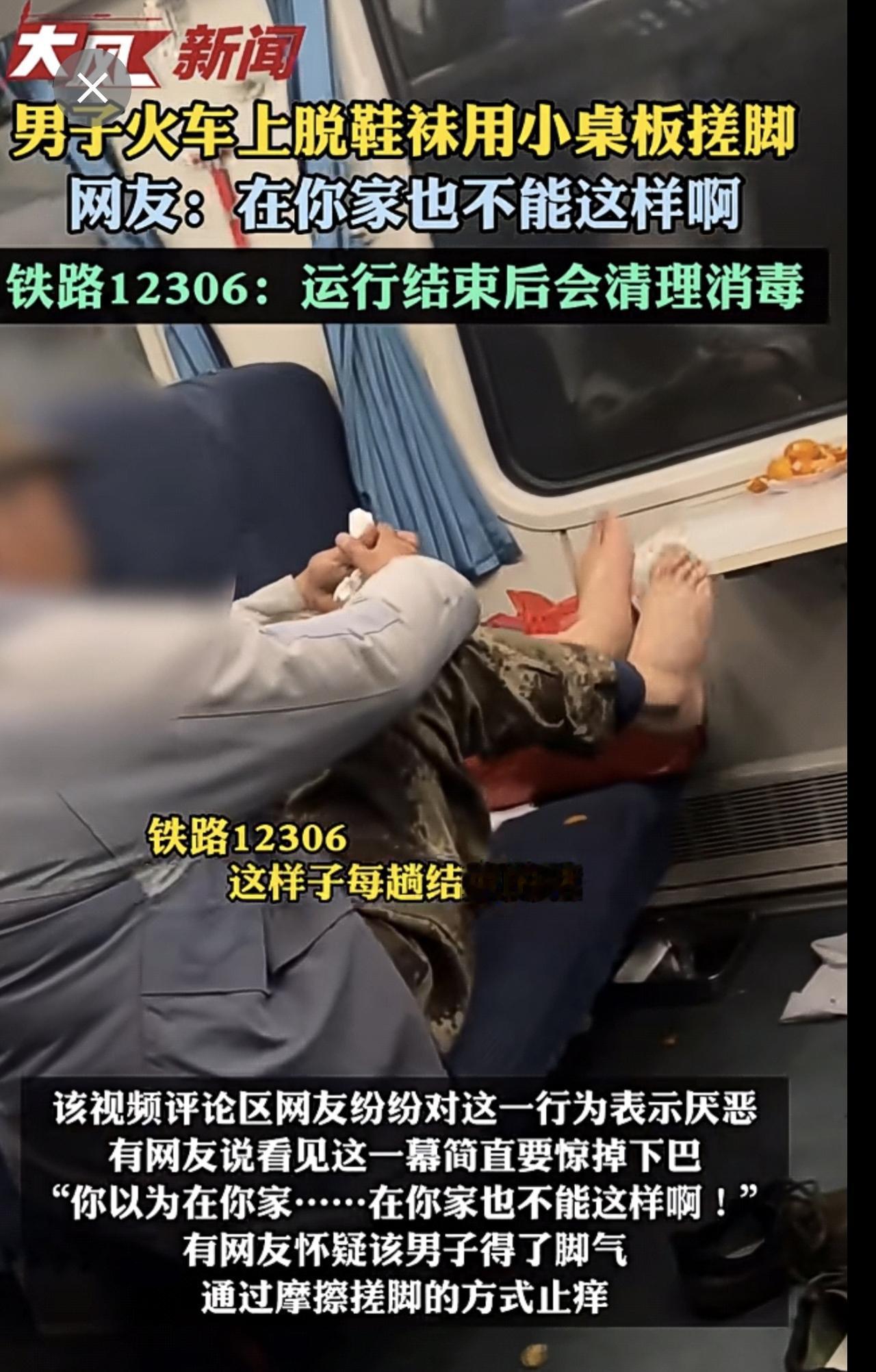 男子火车上脱鞋袜用小桌板搓脚,网友惊呆:在你家也不能这样啊;铁路12306:运行