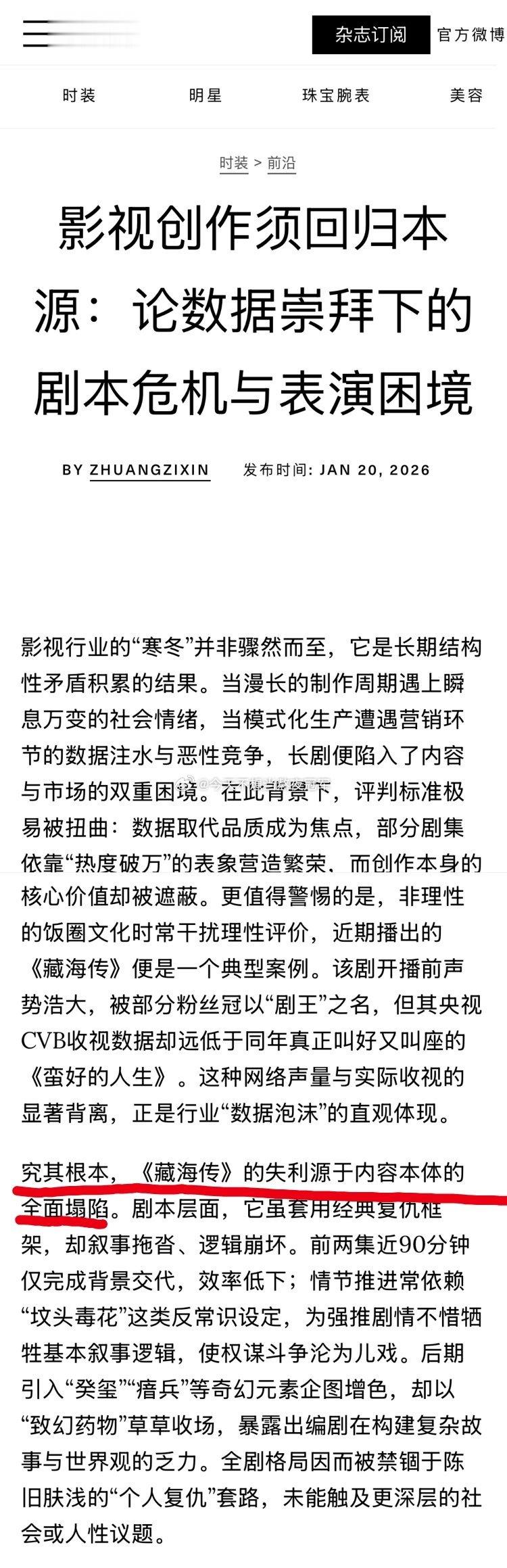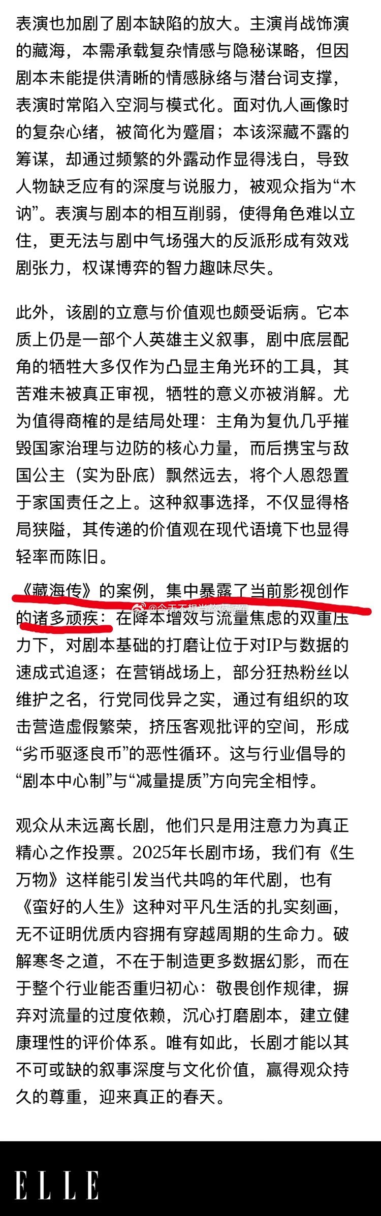 ELLE官网说被非授权手段发布了文章,澄清文章中的描述为不实内容。好像是发了一篇批评肖战《藏海传》的长文,剧播完这么久了,怎么还来这一套?肖战有效播剧演员榜top1