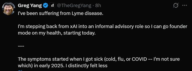 1月21号消息,据外媒报道,xAI公司的联合创始人GregYang周二在社交媒体上发文表示自己得了莱姆病,决定辞掉工作。