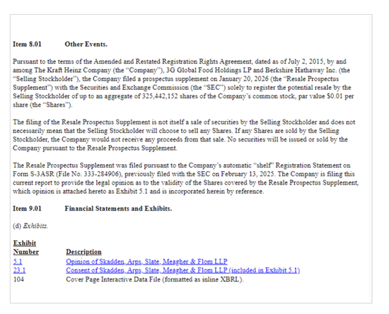 美国证券交易委员会(SEC)最新文件显示,伯克希尔或出售卡夫亨氏股份。截至目前,伯克希尔的持股比例为27.5%。卡夫亨氏此前宣布重组交易将于2026年完成。