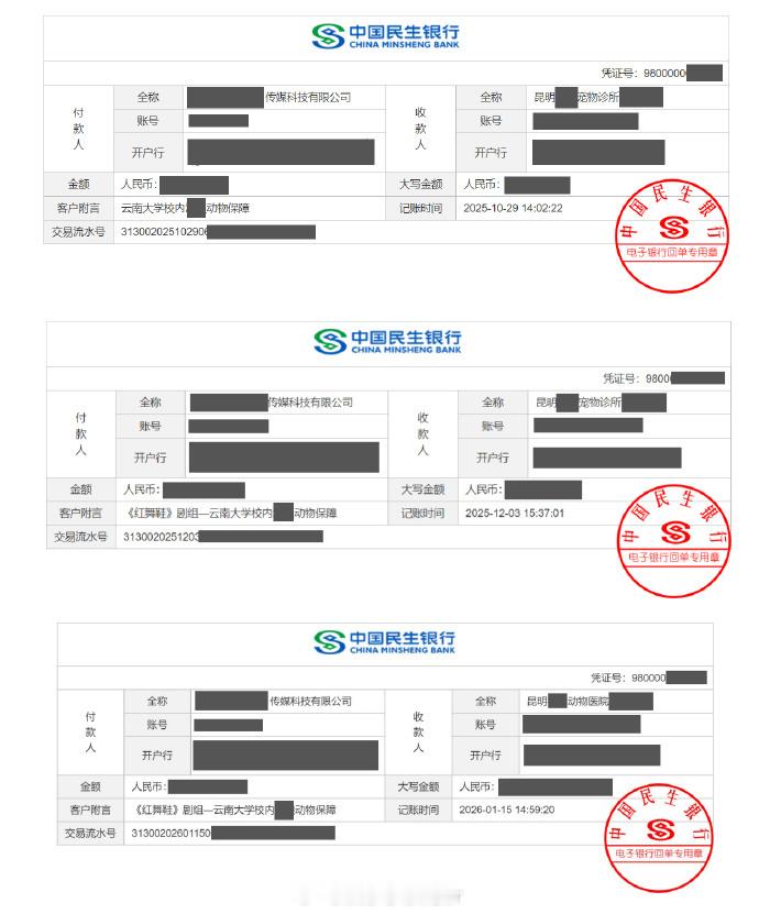 红舞鞋剧组晒捐款凭证 去年《红舞鞋》剧组因撞猫事件引发热议,今日晒捐款记录,配文:“自2025年10月底起,《红舞鞋》剧组就开始在各方共同认可的方案下,持续为校园内的小动物们献爱心。”