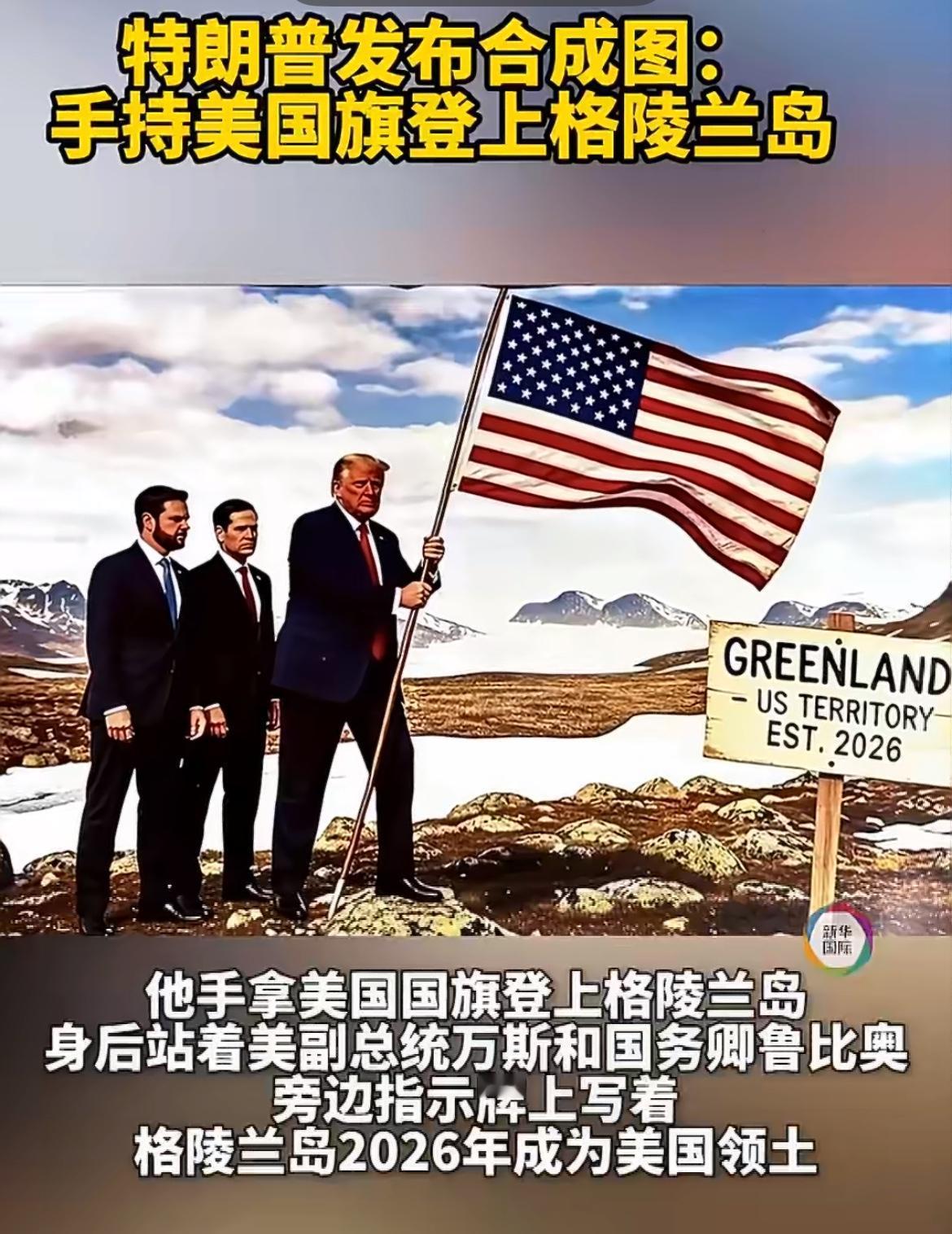 世界都懵了!特朗普公布了登上格陵兰岛的照片! 1月20日凌晨,特朗普在社交媒体上晒出他手持美国国旗登上格陵兰岛的照片,其身后站着美国副总统万斯和国务卿鲁比奥,旁边指示牌上写着“格陵兰岛2026年成为美国领土”。 由此可见,美国对格陵兰岛的贪欲一目了然。此前,特朗普就多次宣称,格陵兰岛“对美国国家及全球安全至关重要,此事没有回头路”,现在看起来是认真的。 尽管格陵兰岛隶属丹麦,且美国是丹麦的盟友,但这丝毫没能动摇美国夺岛的决心。以往或许没人相信特朗普会做出如此出格的事,如今他公布了照片,足见其急切心情。美国此举虽然荒诞,但以特朗普的行事风格,这一切成为现实也不是不可能了。 欧洲和丹麦虽强烈反对、谴责,但长期受美国掣肘,恐怕也无可奈何。此后若找不到有效的应对之策,最终很可能遂了美国的心愿,让其侵占格陵兰岛成为既定事实。那无疑会彻底打破二战后的国际秩序,世界版图或许将被重新改写!