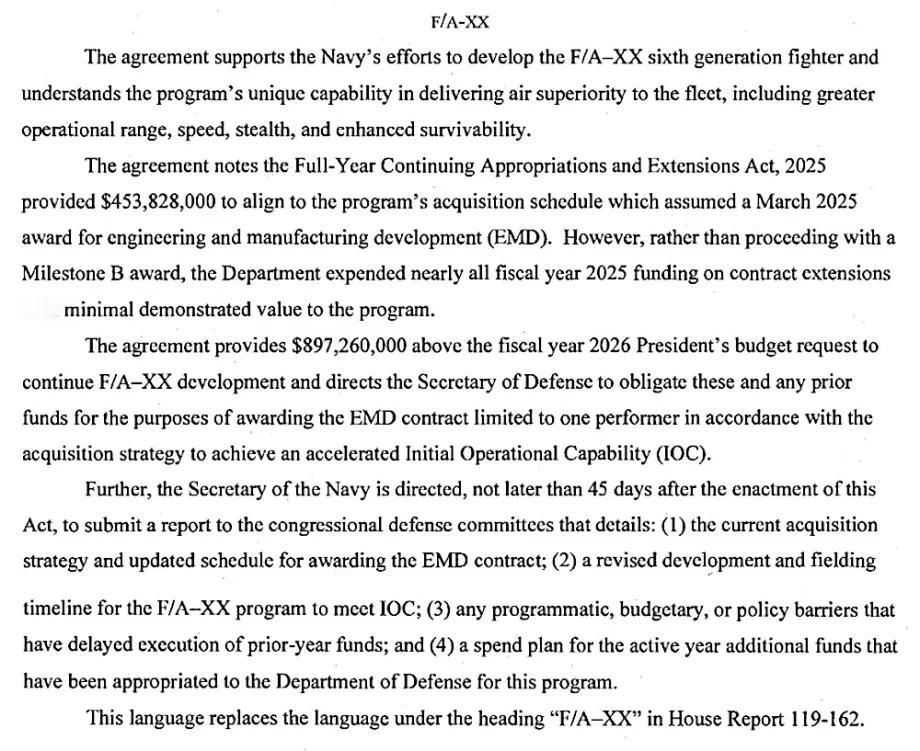 【美国六代机F/A-XX“死而复生”背后的美国军政博弈】 美国国会最新拨款法案为海军F/A-XX第六代战斗机“输血”近9.7亿美元,使其从“冻结”状态中强行重启。这表面是技术路线的调整,实则是华盛顿内部权力拉扯的缩影。五角大楼此前以“工业基础难以支撑两大项目同步”为由,欲将资金优先供给获总统力挺的空军F-47,但国会则以“中国战机快速发展威胁美军太平洋制空权”为由强力干预。这种拉扯暴露了美军在资源有限下的战略摇摆:既要维持全球技术霸权,又苦于工业空心化与成本失控的窘境。F/A-XX的“复活”绝非单纯的技术胜利,而是美军内部海空力量争夺资源、国会借“中国挑战”扩权的政治博弈。它的前途仍系于美国能否理顺扭曲的军工复合体利益链,否则再多的拨款也难逃“纸面先进”的命运。