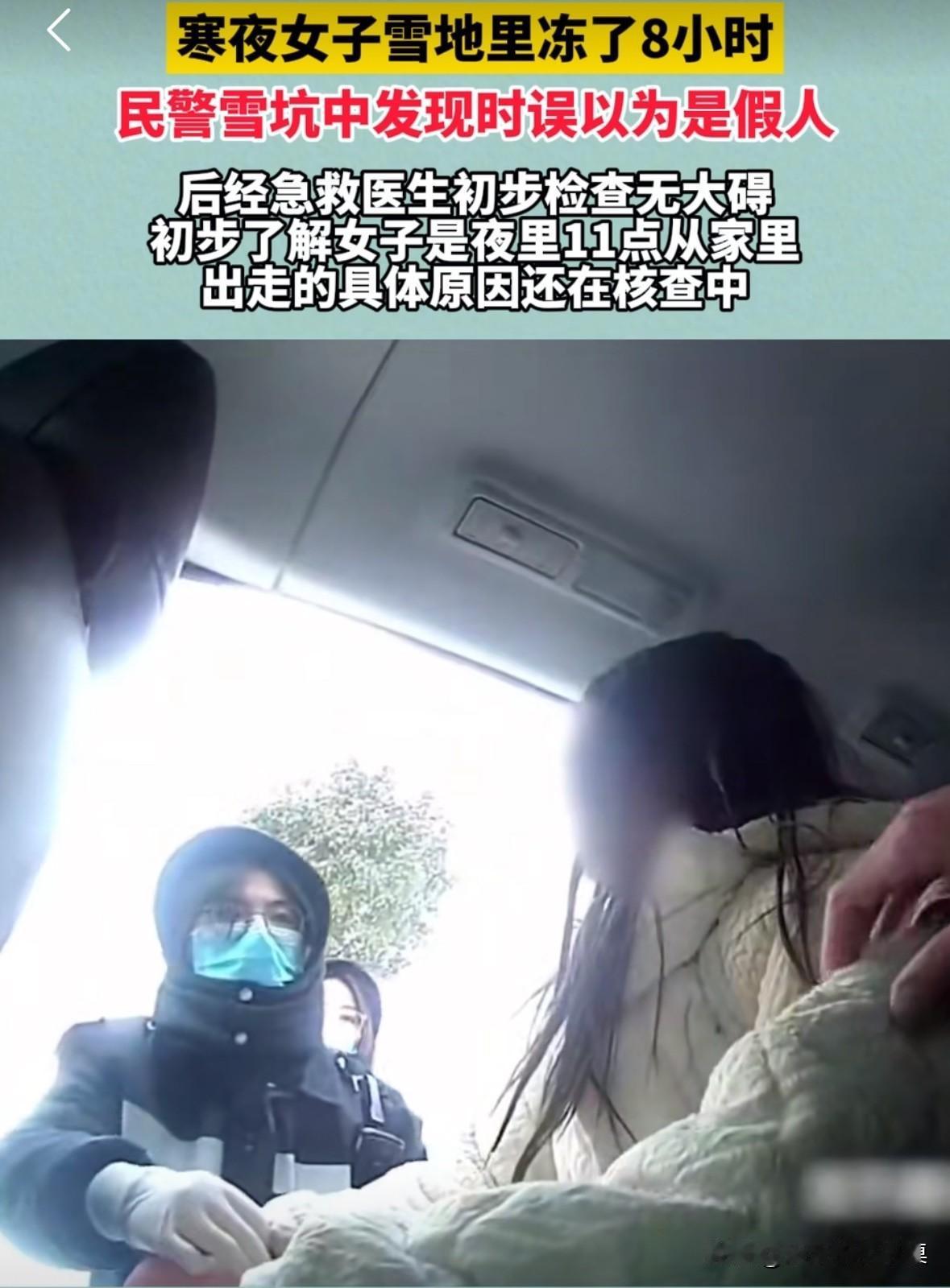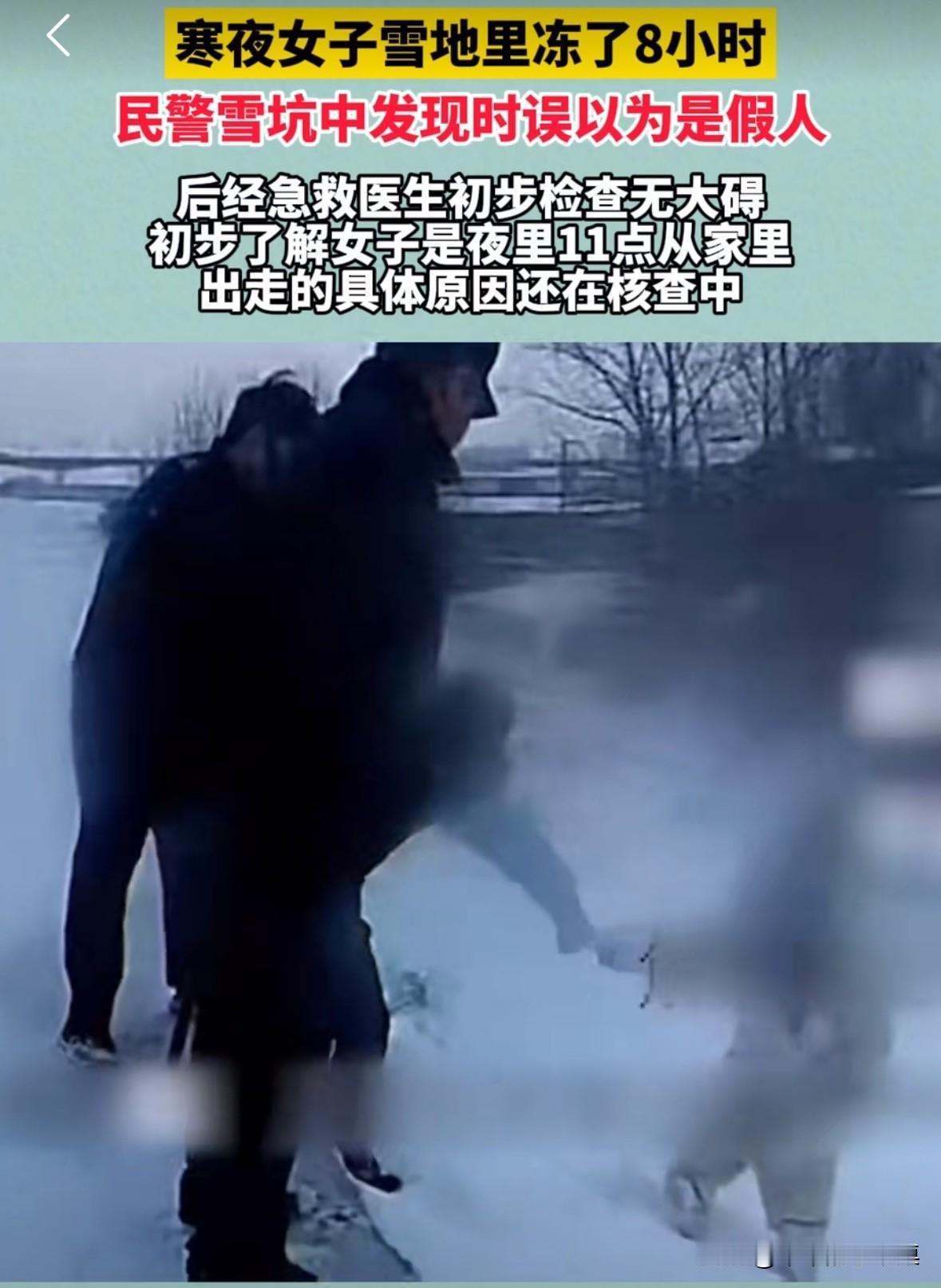 寒夜女子在冰天雪地里冻了8个小时,民警看到后还以为是假人。 民警把女子抬上车时,女子的双腿都被冻的僵硬。 据了解,女子是半夜11点离家出走的。经过急救女子并无大碍。 我觉得应该是女子跟家人吵架被赶了出来,无处可去,才被冻了这么久。 这么长时间家人都不出去寻找,只有婆家人才会这么狠心吧!