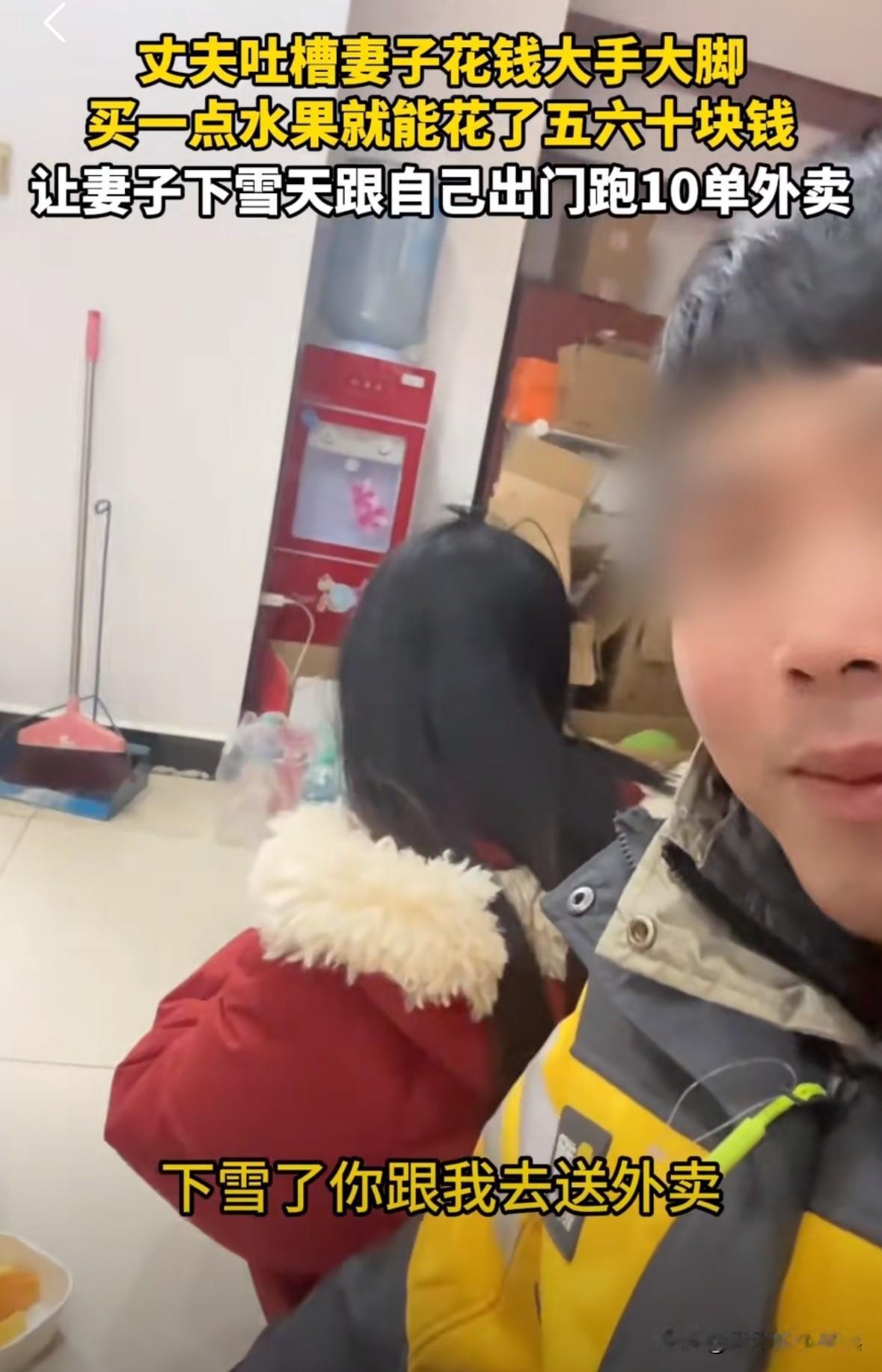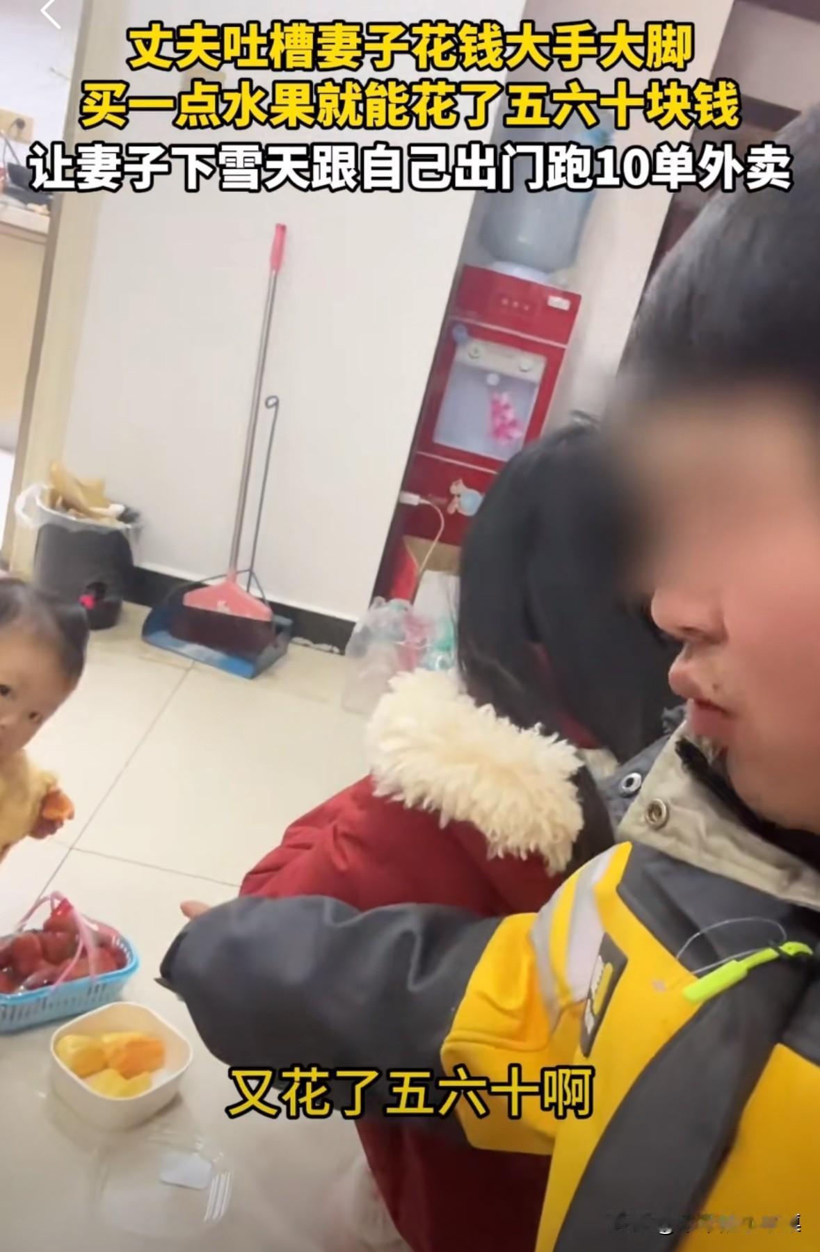 妻子买了五六十块钱的水果给孩子吃,送外卖的老公发现了大发雷霆,吐槽妻子花钱大手大脚! 老公说:“就买这一点水果就花了五六十,下雪了你跟我去送外卖,一单15,你必须把它搞回来,我要让你知道挣钱多不容易!” 如果你老婆天天这样买,是她不对,如果一个月才买一次,是不是看一下自身的问题! 男人没本事,就不要怪妻子花的多,更何况都是给孩子买的! 这男的,趁早跟他离婚,他觉得自己辛苦挣钱,就容不得你在家闲着,男人挣钱就是为了老婆孩子热炕头。 这男的一点责任心都没有,一辈子都发不了财老婆花钱大手大脚 外卖小哥 !
