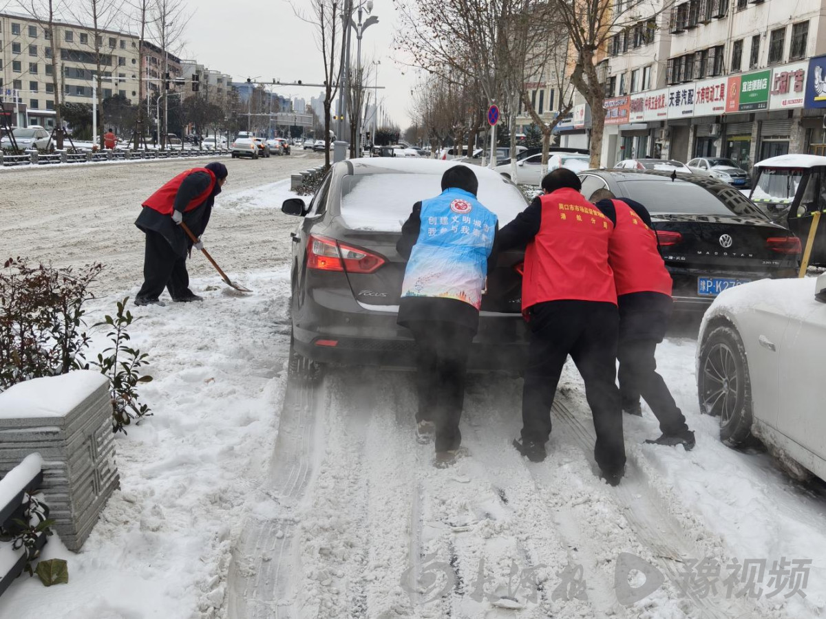 在清扫过程中,周口市市场监督管理局港航分局志愿者们发现多名群众因车辆打滑被困路上,立即主动上前帮扶。大家齐心协力推车助行,耐心提醒驾驶员减速慢行,并协助清理车辆周边积雪,帮助被困群众顺利脱困。过往市民纷纷点赞:“雪天路滑正发愁,多亏了周口市市场监管局的志愿者们,真是太贴心了!”