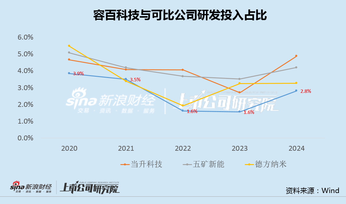值得注意的是,长期以来,容百科技研发支出占同期营业收入比例仅为1.6%至3.9%,研发投入力度显著低于当升科技、五矿新能和德方纳米等正极材料头部企业。