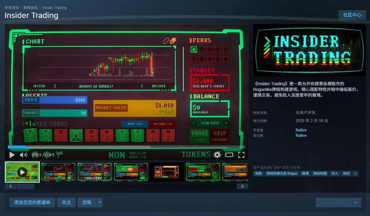 【谁有多余资金】炒股题材肉鸽牌组构建游戏《Insider Trading》将于2月18日登陆Steam,支持中文,商店页面有免费试玩Demo。在每局游戏中,你将扮演一位掌握着独特策略与一套能够在股市呼风唤雨的卡组的股票交易员。打出手牌调整股价并控制市场波动。贪婪就像是驱动利益与风险的火箭燃料。只有你自己能够决定何时收手套现。