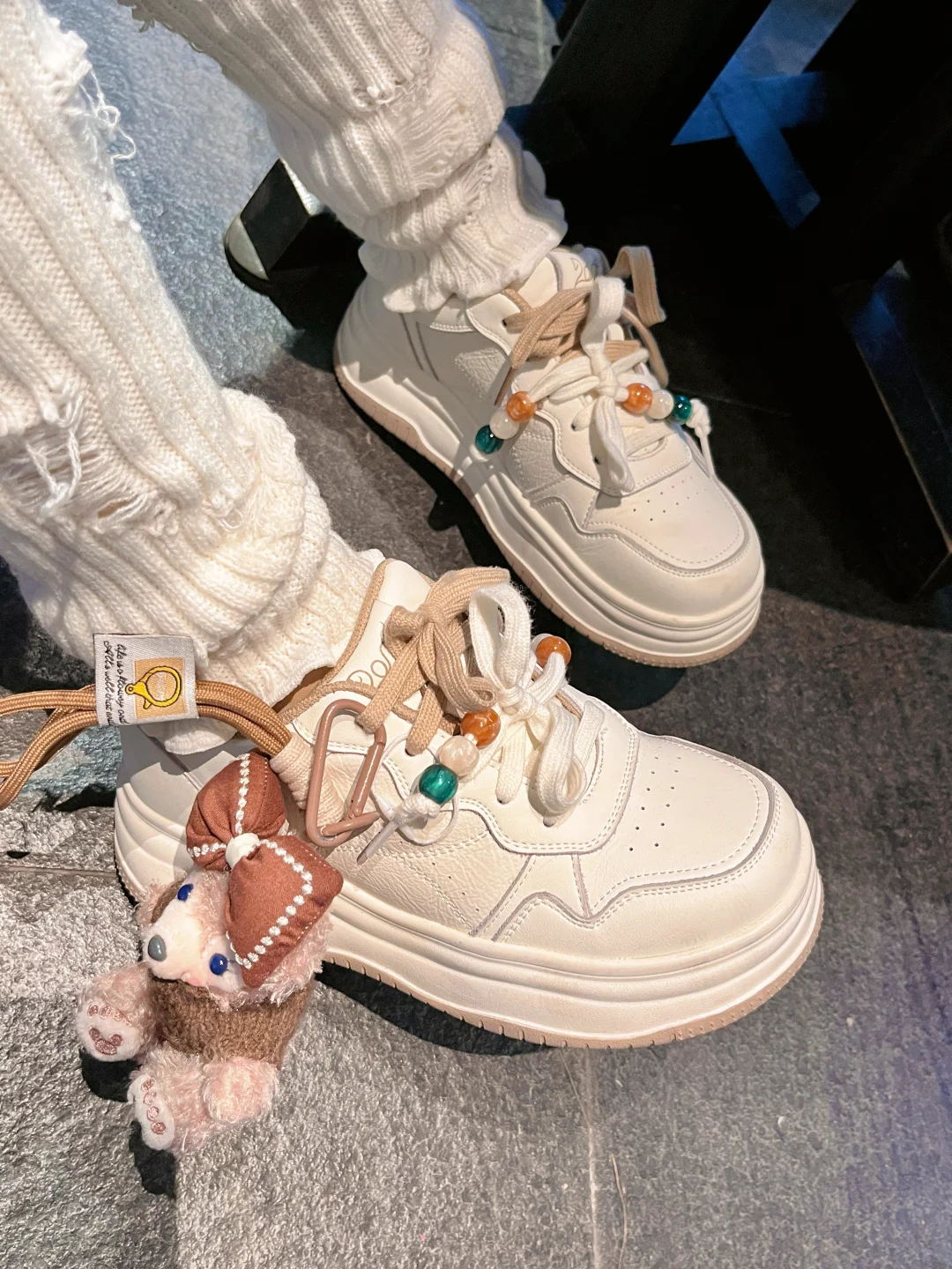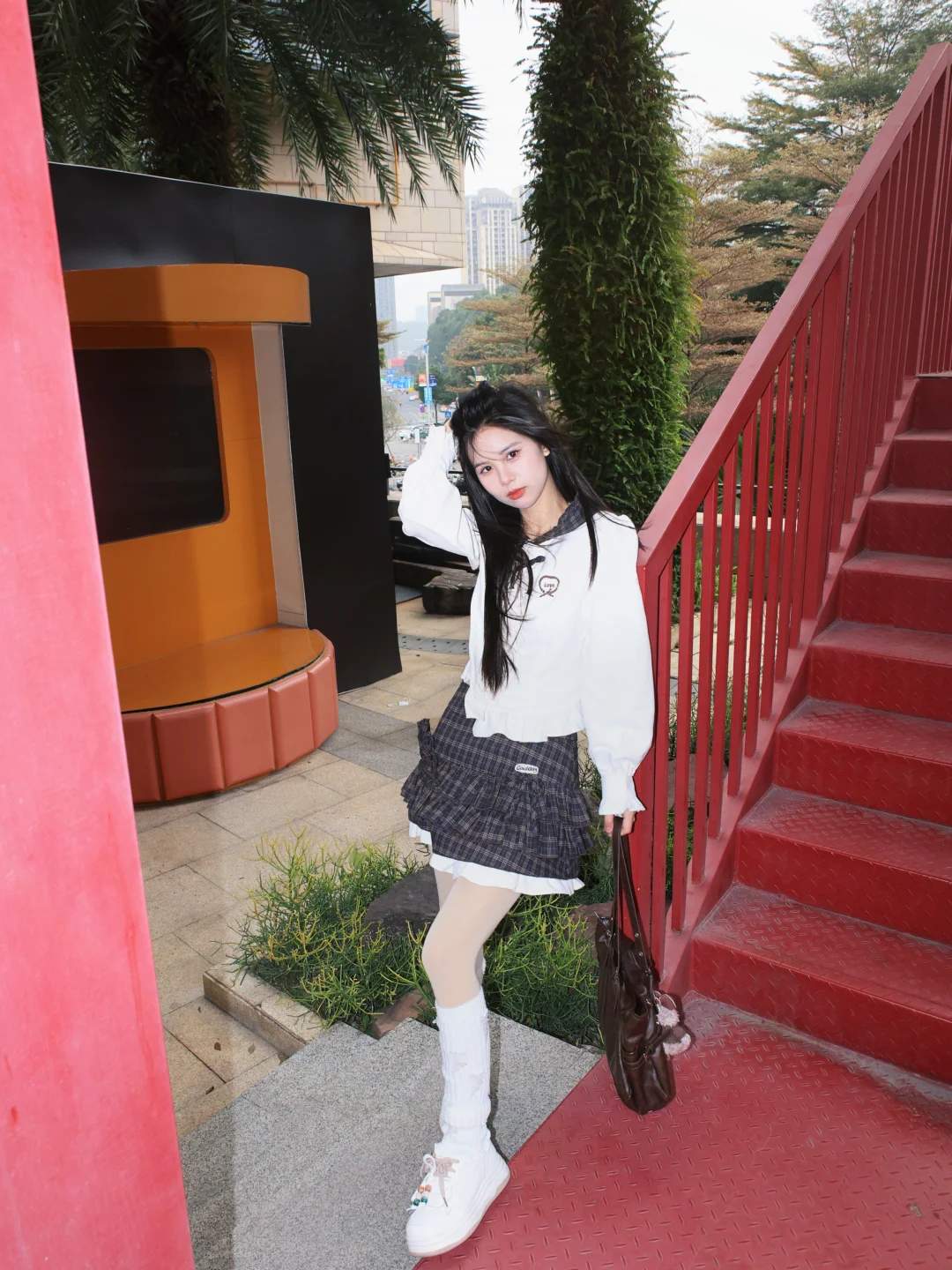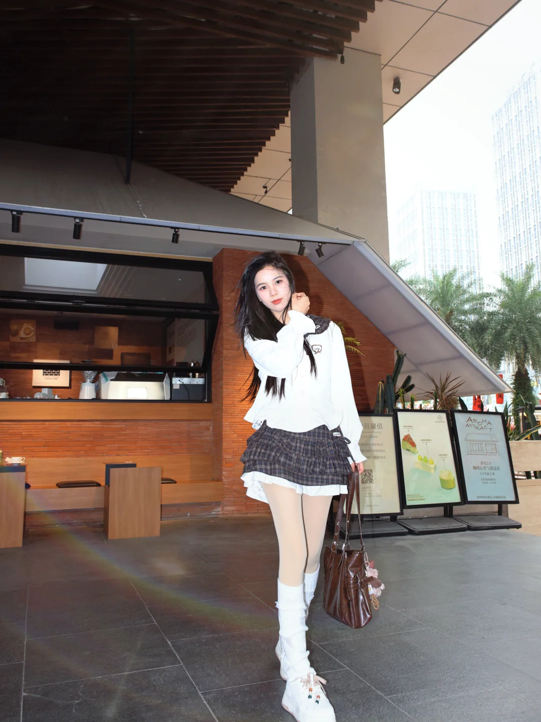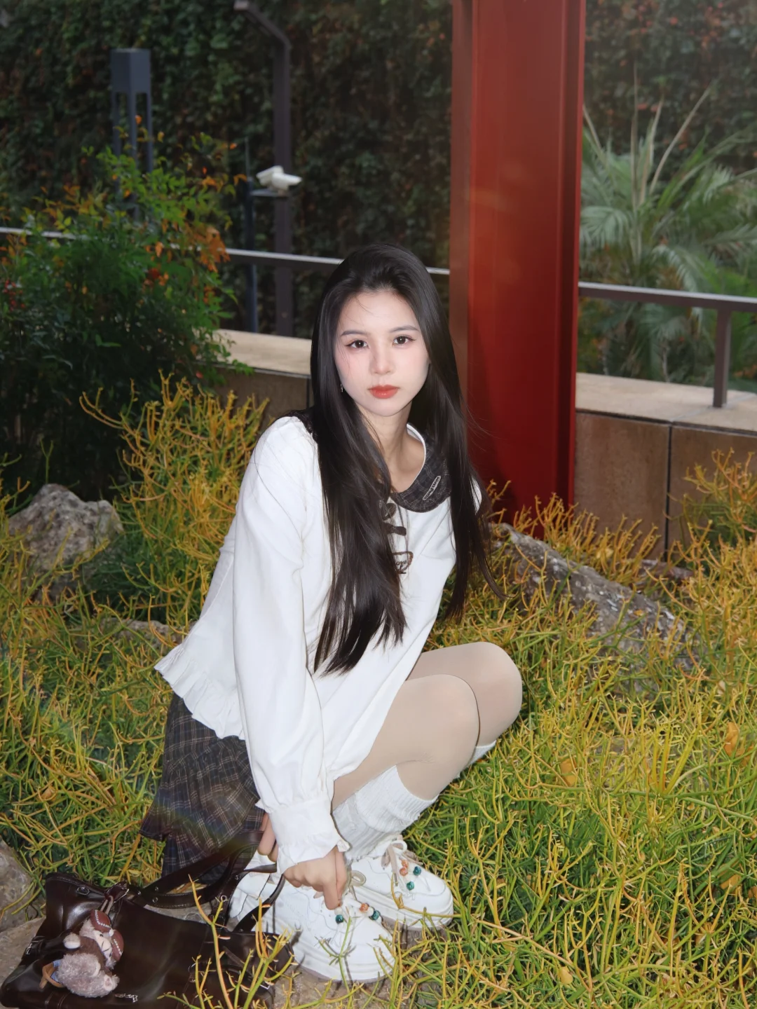 软乎乎的娃娃领白衬衫太乖了,领口的小蝴蝶结和下摆的褶皱,把可爱氛围直接拉满✨ 搭配格纹蛋糕裙,层次感一下就出来了,白丝配堆堆袜更是把甜妹精髓焊在身上。 脚上这双奶fufu的意尔康厚底鞋是点睛之笔,彩色串珠和双鞋带细节感拉满,走一天都不累! 随便在街头楼梯和草丛拍一拍,都自带复古滤镜,松弛感直接拿捏住~