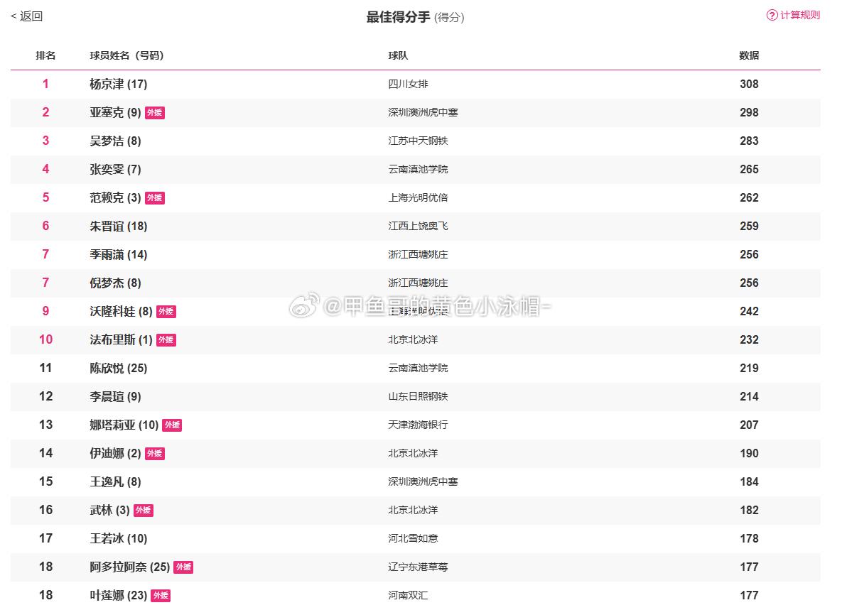 2025-2026中国女排超级联赛 女排联赛截止目前为止得分榜排名:1. 杨京津308分2. 亚塞克298分3. 吴梦洁283分4. 张奕雯265分5. 范瑞克262分6. 朱晋谊259分7. 季雨潇256分7. 倪梦杰256分9. 沃龙科娃242分10. 法布里斯232分