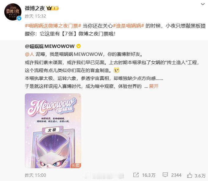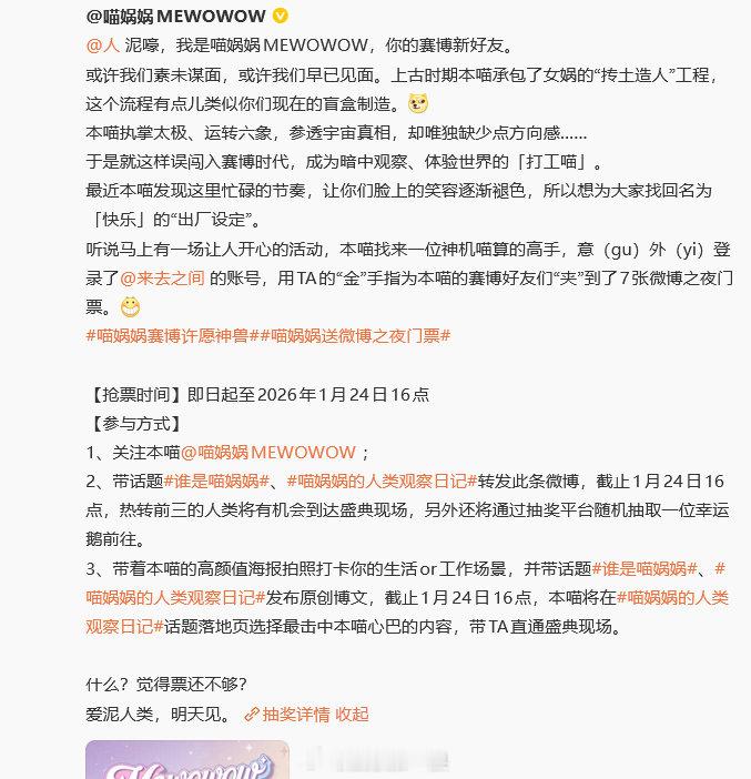 喵娲娲 夹微博之夜门票喵娲娲 谢谢来总再送4张门票 别人摸鱼是偷时间,摸鱼是酝酿