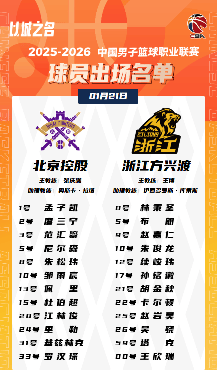 虎扑01月21日讯今晚CBA常规赛,北控对阵广厦的大名单已经公布。