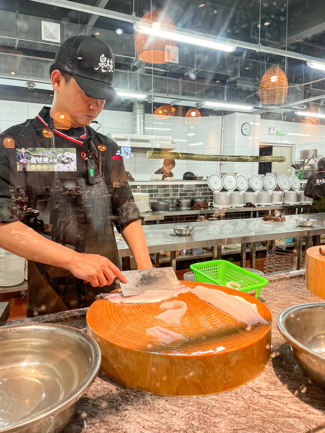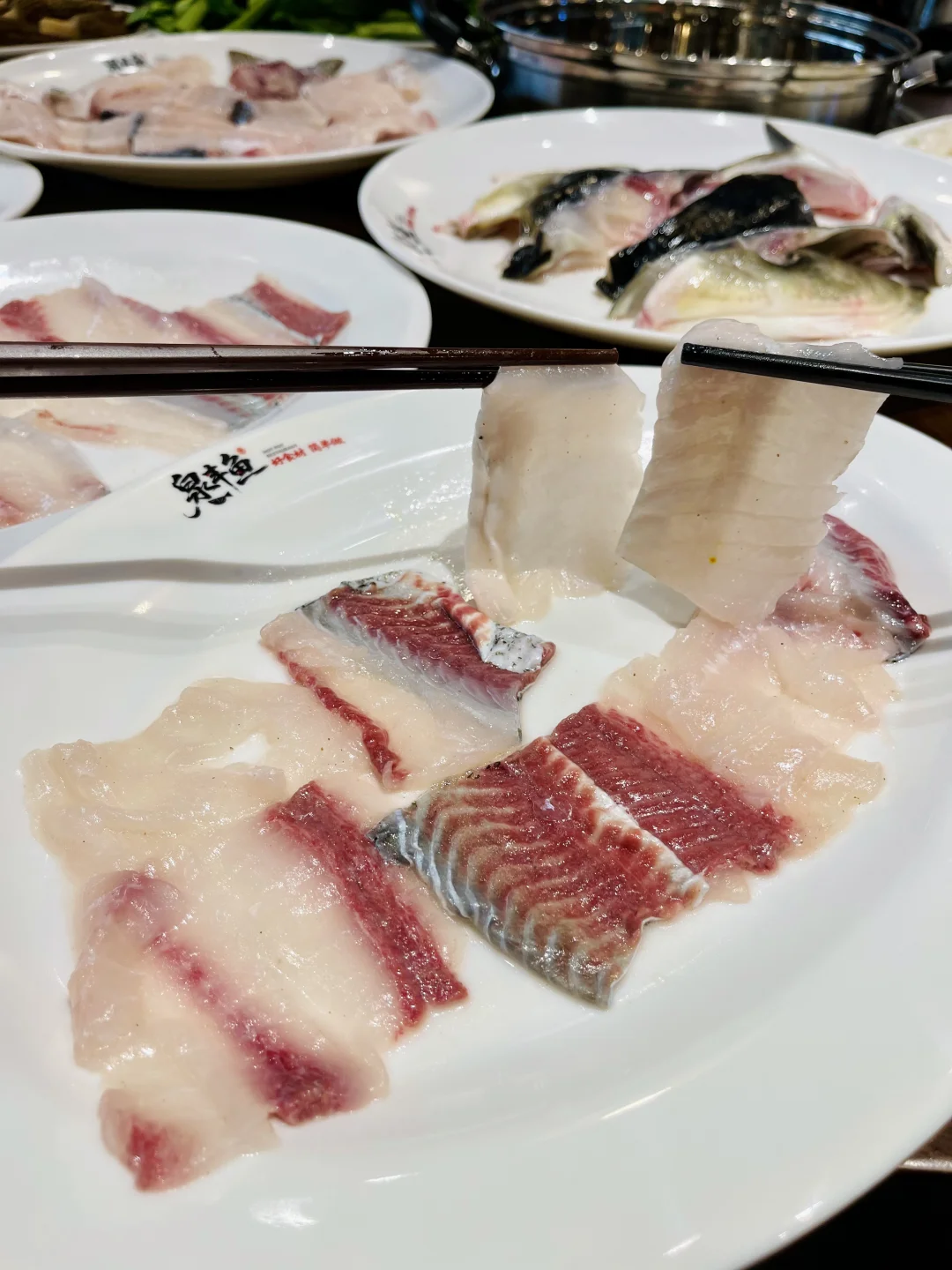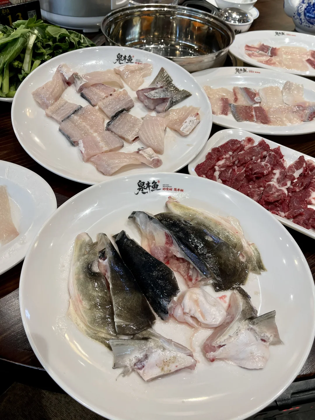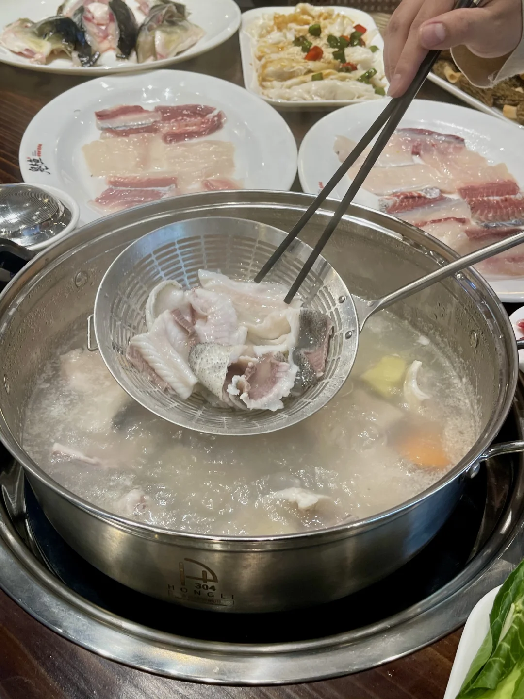 这里主打吃鱼🐟也有阳山鸡和水鱼~牛肉!都有! 我们点了一整条大头鱼,吃鱼,往大只的点,按斤算~ 现点!现捞!现🔪 切🐟鱼片还有鱼头跟鱼骨! 看着切出来薄透的鱼片,就知道!新鲜! 广东的就爱这样,清水打边炉,去骨清水烫鱼,慢慢打散,几秒就能吃,鲜甜又嫩滑~ 蘸料只需要调个姜丝葱丝酱油花生油蘸料,就好惊艳了!吃的就是本身的的味道。 谁吃谁知道! - 小榄新店小榄美食小榄吃鱼中山鱼火锅中山吃喝玩乐中山打边炉小榄鱼火锅小榄火锅食过番寻味本地人爱吃的店小榄泉丰鱼中山旅游攻略