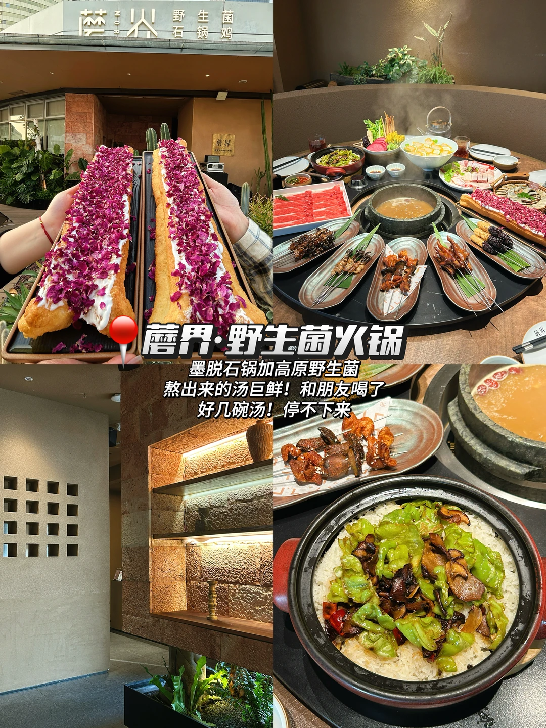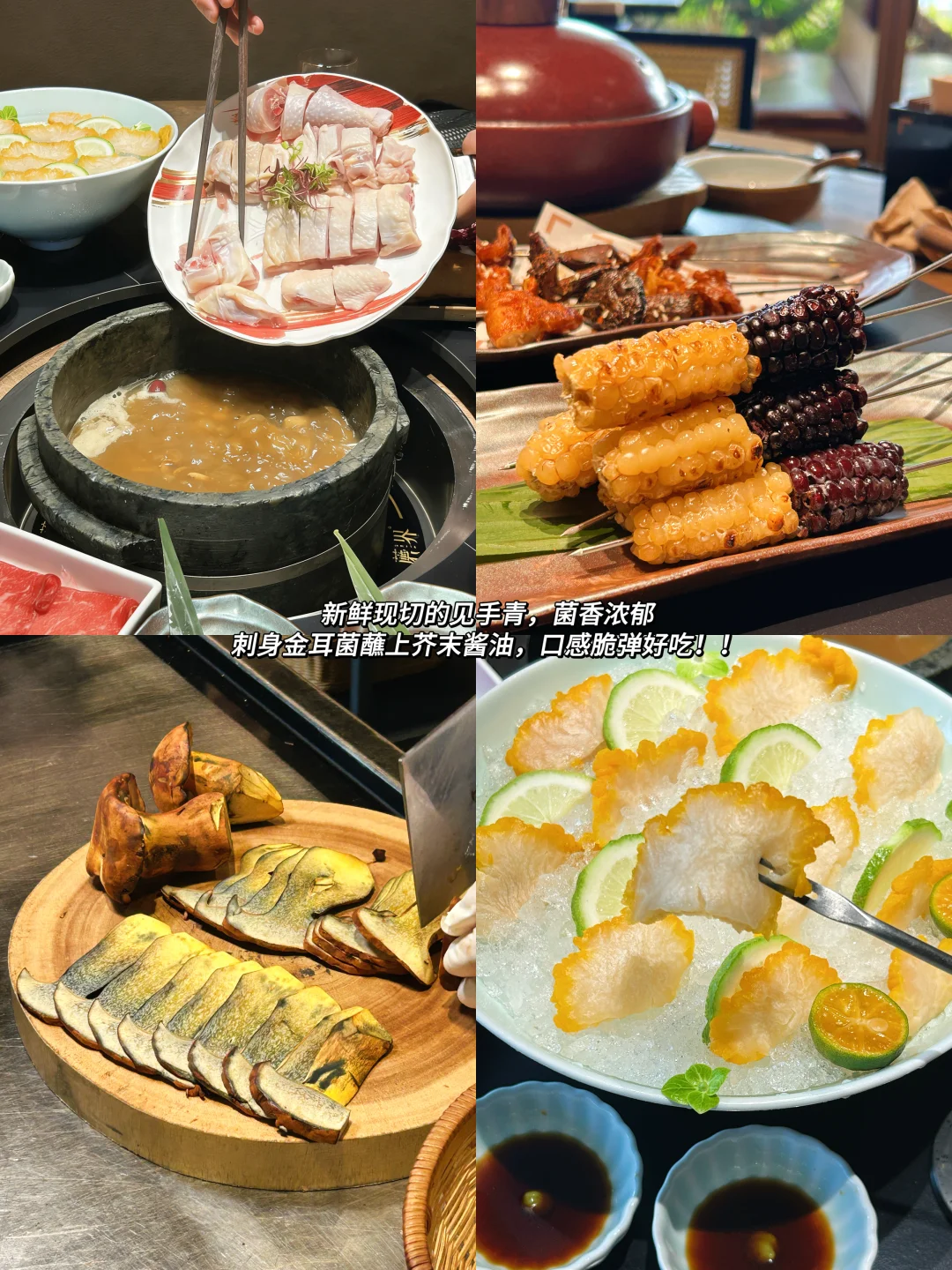 墨脱石锅加高原野生菌熬出来的汤巨鲜‼️和朋友喝了好几碗汤🤤新鲜现切的见手青,菌香浓郁,刺身金耳菌蘸上芥末酱油,口感脆弹好吃!还有玫瑰油条,酥酥脆脆敲好吃❤️🔥