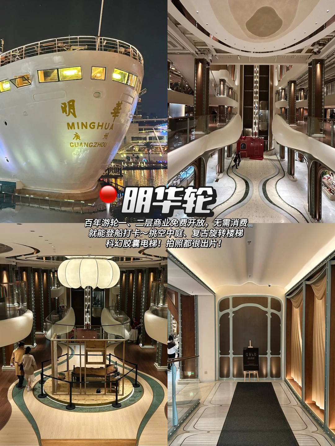 游轮一、二层商业区免费开放了,挑空中庭、复古旋转楼梯、科幻胶囊电梯📷拍照都很出片‼️还有各种文创店和精致餐厅🥳